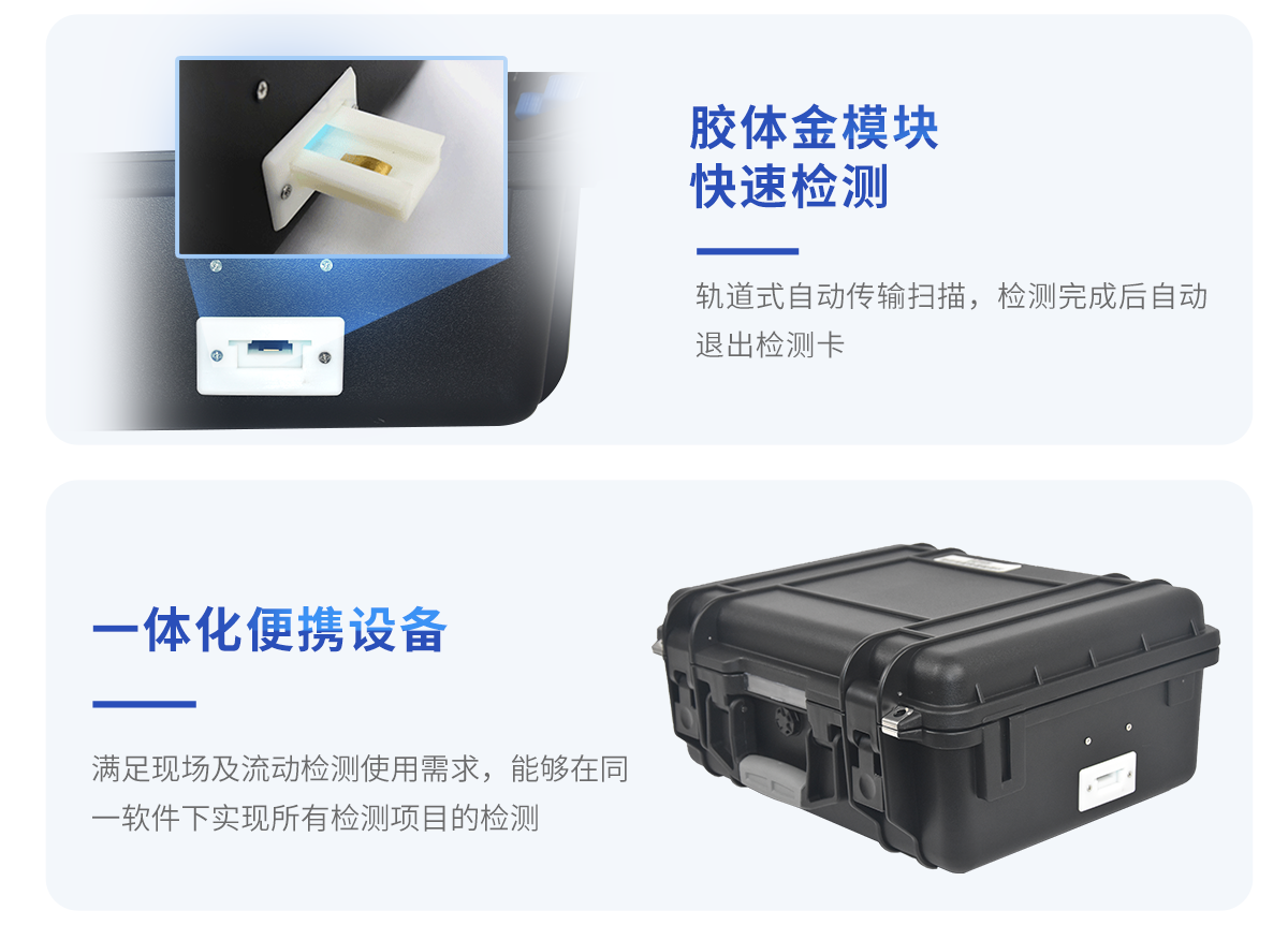| 安卓智能操作系統,采用更加**和人性化操作,儀器具有wifi聯網上傳、4G聯網傳輸、GPRS無線遠傳、網線連接功能,快速上傳數據。 | 智能化程度高,儀器具有自檢功能:具有開機自檢和調零功能,具有自動檢測重復性功能。 | 新一代高速熱敏打印機,檢測完成可自動打印檢測報告和二維碼。 | 儀器帶有監管平臺,數據可局域網和互聯網數據上傳,檢測結果直接傳至食品安全監管平臺。進行區域食品安全監管及大數據分析處理與數據統計,檢測區域食品安全長短期動態,達到食品安全問題預估、預警 | 一體化便攜式快檢設備,滿足現場及流動檢測使用需求,能夠在同一軟件下實現所有檢測項目的檢測,并可通過同一窗口直觀顯示檢測結果。 | 膠體金模塊檢測方式:軌道式自動傳輸掃描,檢測完成后自動退出檢測卡。 | 儀器內置攝像頭拍照,可顯示金標卡實時圖像,系統自動分析并呈現出CT曲線圖,CT線自動識別,無需手動調整。 | 儀器具有品類多種類樣品菜單庫,可靈活選擇檢測樣品,不同的檢測通道可同時檢測不同的樣品項目。 | 樣品處理簡單省力,整體操作快速、安全、便捷。 | 高靈敏度,高檢測精度,高重復性精度,掃描式高精度光學傳感器。 | 內置強大的數據庫,可在儀器上直接選擇樣品名稱、檢測指標、送檢單位等信息,也可在儀器上直接編輯錄入樣品名稱、檢測指標、送檢單位等信息并保存進樣品數據庫。 | 儀器具有自身保護功能,可設置用戶名及密碼,防止非工作人員操作等。 | 儀器具有重新校準、鎖定、恢復出廠設置功能。 | 結果判定線可修改,對照值標定值可保存,斷電不丟失數據。 | 兼容市場上所有的膠體金卡,使用耗材不受限制,極大增強用戶使用體驗。 |