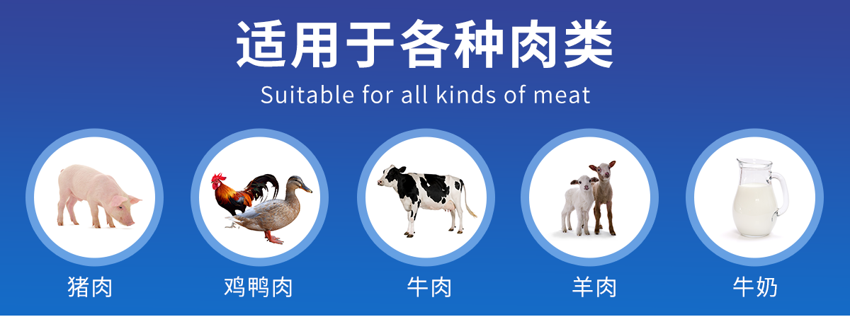 | 瘦肉精激素類(獸藥):鹽酸克倫特羅、沙丁胺醇、萊克多巴胺、己烯雌酚、喹乙醇等 | 抗生素殘留類(獸藥):四環素類、硝基呋喃類、磺胺類、沙星類、喹諾酮類、慶大霉素、鏈霉素、阿莫西林、紅霉素等 | 水產品安全類:孔雀石綠、氯霉素、呋喃妥因代謝、呋喃西林代謝、呋喃它酮代謝、呋喃唑酮代謝等 | 以及病害肉及肉類新鮮度的擴展檢測。 |