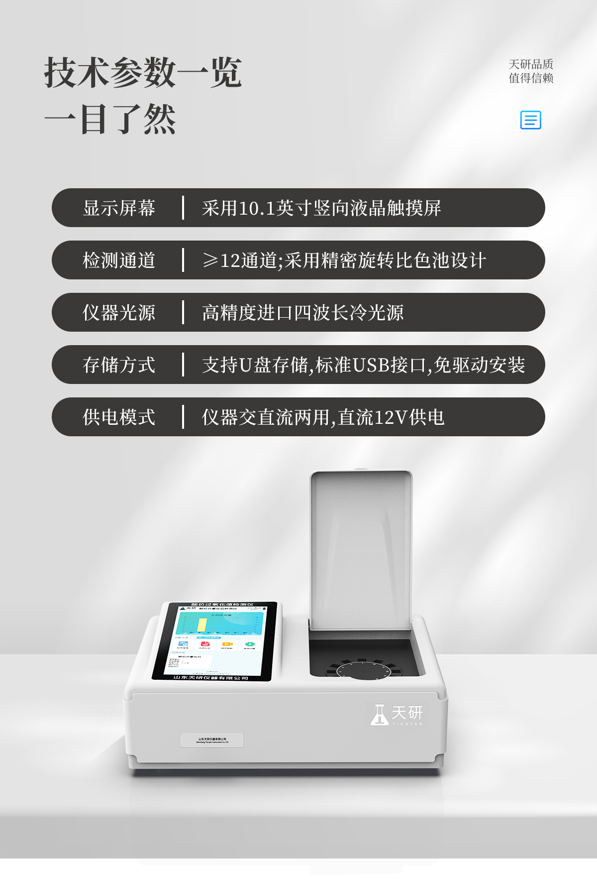 | 儀器采用臺式一體化系統檢測技術,將分光光度模塊、新型農殘檢測模塊、數字化管理模塊、無線通訊模塊高度集成于一體,支持檢測200種食品安全檢測項目,同時預留升級檢測方法。 | 儀器檢測模塊標準化、智能化,可隨意自由組合。檢測箱體內置多個標準檢測單元,檢測模塊可以調整配置。 | 儀器采用全新安卓智能系統,主控芯片采用 ARM Cortex-A7,RK3288/4核處理器,10.1寸高清液晶觸摸豎屏,更加**的UI交互界面,運轉快捷;儀器配備無線通信模塊: 4G(APN)通訊模塊、Wifi模塊,藍牙傳輸,同時具有雙USB接口以及RJ45接口能以多種方式實現數據保存和數據傳輸功能。 | 創新檢測模式: | ★檢測通道:≥12通道;采用精密旋轉比色池設計,使用同芯片同光源校準精度,解決不同光源之間的誤差值。1-12通道間誤差0.1%。(**號:ZL202022821055.2) | ★儀器具有自動識別比色皿檢測功能,即:將樣品比色皿放入儀器后,點擊樣品檢測,儀器自動識別比色皿進行通道檢測。 | 進口高精光源: | 高精度進口四波長冷光源,通道配置 410、520、590、630nm 波長光源,一個光源芯片驅動一個光源,誤差極小,每臺設備單獨**校準光源,**比對,同時參照四種不同波段光源全方位覆蓋市面上99%的農殘食品項目檢測。 | 智能化操作系統: | 便捷操作系統:設備檢測時可在同一檢測界面自動對應相關檢測通道一次性選擇1-12個樣品名稱,無須退出界面,節省操作時間。 | 數據集成系統:設備首頁自動統計檢測數據包含:周檢測數據、月檢測數據,全部檢測總數量,均包含檢測總數,合格數,不合格數,以及相關柱形分析圖,對各項檢測數據清晰掌握,無需電腦查詢,更加快捷直觀。 | 項目預設系統:支持添加單個及多個相同或不相同的任務預設,一鍵快速調取,每一個任務分別可以設置不同的樣品、批次、編號、來源、備注、抽樣信息、檢測信息、受檢信息、復核信息等更多信息。無縫鏈接平臺和APP實時查看下發任務。 | 數據監管系統:同步對接監管平臺,數據可局域網和互聯網數據上傳,檢測結果可選擇直接傳至食品安全監管平臺。集成OSS輸出存儲服務、區分設備定向管理應用,進行區域食品安全監管及大數據分析處理與數據統計,檢測區域食品安全長短期動態,達到食品安全問題預估、預警。 | 自定義打印系統:內置全新打印系統,新創自定義打印方式,可按需靈活設置開啟或關閉:產品合格證(國家農業部標準要求),二維碼,抽樣信息、檢測信息,受檢信息、復核信息、抽樣日期、檢測日期等信息的打印。 | 系統遠程更新功能:可定向分客戶分儀器更新系統,按照不同客戶后期實際需求添加項目,無需機器返廠,即可遠程實時升級全新系統,節省時間成本及避免運輸造成設備損壞。 | 儀器主機采用一體化防水、抗壓、防撞擊、防腐蝕箱體設計,同時配備交直流供電,可連接車載電源,可選配大容量充電鋰電池,滿足現場野外檢測需求。 | 安全證書,放心保障:儀器具有中國計量科學研究院校準證書,**認證。 |