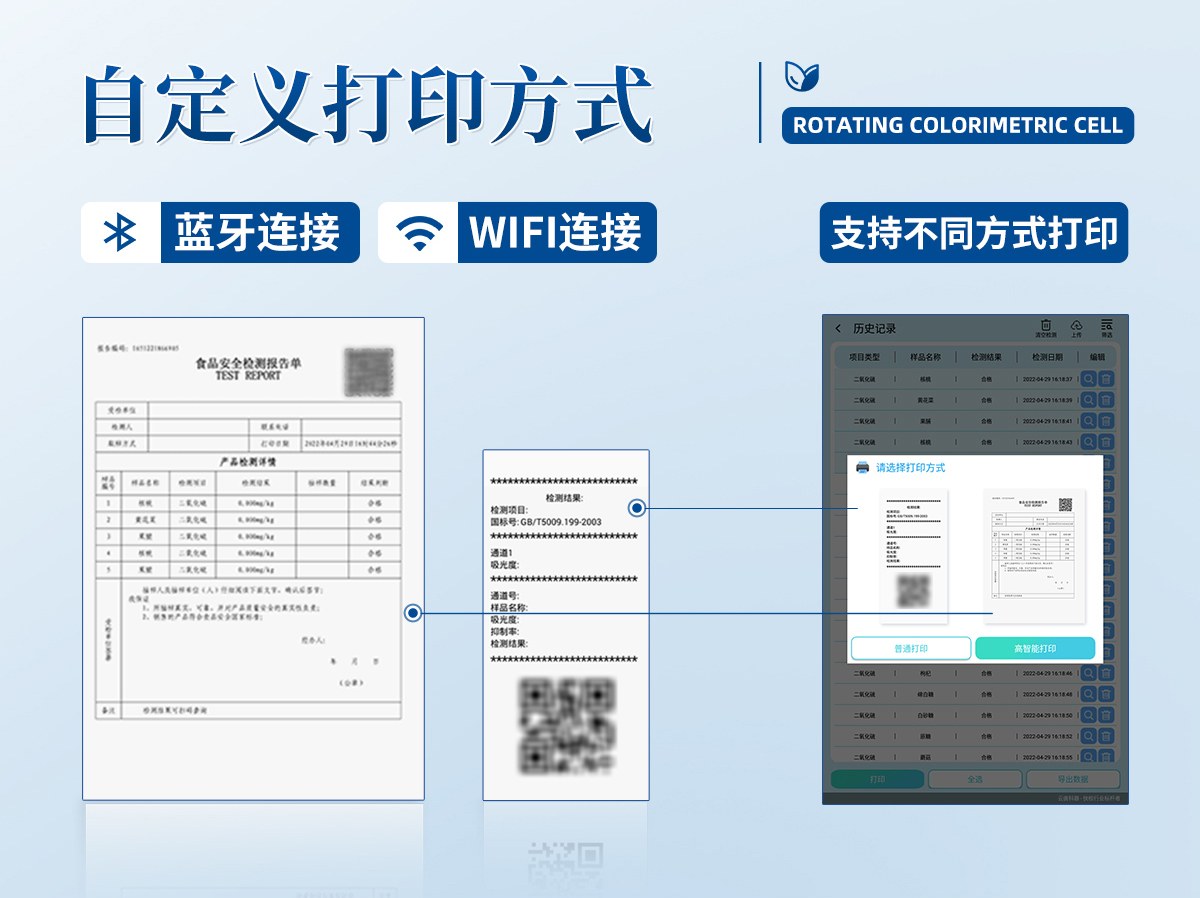 | 儀器采用臺(tái)式一體化系統(tǒng)檢測(cè)技術(shù),將分光光度模塊、膠體金檢測(cè)模塊、新型農(nóng)殘檢測(cè)模塊、數(shù)字化管理模塊、無線通訊模塊高度集成于一體,支持檢測(cè)200種食品安全檢測(cè)項(xiàng)目,同時(shí)預(yù)留升級(jí)檢測(cè)方法。 | 儀器檢測(cè)模塊標(biāo)準(zhǔn)化、智能化,可隨意自由組合。檢測(cè)箱體內(nèi)置多個(gè)標(biāo)準(zhǔn)檢測(cè)單元,檢測(cè)模塊可以調(diào)整配置。 | 顯示屏幕:儀器采用10.1英寸豎向液晶觸摸屏顯,搭配運(yùn)行安卓智能操作系統(tǒng),主控芯片采用ARM Cortex-A7,RK3288/4核處理器,主頻1.88Ghz,操作方便,性能更強(qiáng)。 | 檢測(cè)通道:≥24通道;采用精密旋轉(zhuǎn)比色池設(shè)計(jì),使用同芯片同光源校準(zhǔn)精度,解決不同光源之間的誤差值,更加準(zhǔn)確**。(1-12通道間誤差0.1%,**號(hào):ZL202022821055.2) | 儀器光源:高精度進(jìn)口四波長(zhǎng)冷光源,每個(gè)通道均配置 410、520、590、630nm 波長(zhǎng)光源,標(biāo)配**的光路切換裝置,**光路切換功能可實(shí)現(xiàn)64波長(zhǎng),并且所有檢測(cè)項(xiàng)目可實(shí)現(xiàn)所有通道同時(shí)檢測(cè)。 | 設(shè)備可一鍵校準(zhǔn),自動(dòng)保存校準(zhǔn)數(shù)據(jù),自動(dòng)對(duì)比校驗(yàn),得到精準(zhǔn)光源,采用Android SP存儲(chǔ)數(shù)據(jù),光源數(shù)據(jù)永不丟失,方便每一次使用。 | 通訊接口:配備無線通信模塊、可選配4G(APN)通訊模塊和藍(lán)牙傳輸,同時(shí)具有雙USB接口以及RJ45網(wǎng)線接口,可以多方式實(shí)現(xiàn)數(shù)據(jù)保存及數(shù)據(jù)傳輸。 | 存儲(chǔ)方式:支持U盤存儲(chǔ),標(biāo)準(zhǔn)USB接口,免驅(qū)動(dòng)安裝。檢測(cè)結(jié)果存儲(chǔ)容量20萬條以上,可生成Excel表格進(jìn)行拷貝,并具有登錄保護(hù)功能。 | 智能化操作系統(tǒng): | 1、操作系統(tǒng):儀器可在同一檢測(cè)界面自動(dòng)對(duì)應(yīng)相關(guān)檢測(cè)通道,一次性選擇1-12個(gè)樣品名稱,無需退出界面,節(jié)省操作時(shí)間。并可以對(duì)每個(gè)通道屬性和樣品信息單獨(dú)進(jìn)行編輯,例如送檢單位、人員,檢測(cè)人員等,打印時(shí)勾選打印顯示。 | 2、數(shù)據(jù)集成系統(tǒng):設(shè)備首頁(yè)自動(dòng)匯總分析檢測(cè)數(shù)據(jù),包含:周檢測(cè)數(shù)據(jù)、月檢測(cè)數(shù)據(jù),總檢測(cè)數(shù)量,均包含檢測(cè)總數(shù),合格數(shù),不合格數(shù),以及相關(guān)柱形分析圖,各項(xiàng)檢測(cè)數(shù)據(jù)一目了然,無需電腦查詢,更加快捷直觀。 | 3、數(shù)據(jù)庫(kù)系統(tǒng):十幾項(xiàng)數(shù)據(jù)庫(kù)分類管理儀器:包含項(xiàng)目類型、項(xiàng)目數(shù)據(jù)、檢測(cè)數(shù)據(jù)、歷史記錄、國(guó)標(biāo)信息、曲線信息、采樣信息、檢測(cè)信息、受檢信息、復(fù)核信息、圖表信息、光源校準(zhǔn)信息、打印樣式信息、樣品庫(kù)信息等等,數(shù)據(jù)庫(kù)之間互相協(xié)調(diào)聯(lián)動(dòng)保證數(shù)據(jù)的真實(shí)完整性。同時(shí)產(chǎn)品數(shù)據(jù)庫(kù)以及歷史檢測(cè)記錄支持一鍵檢索功能。 | 4、限量規(guī)判系統(tǒng):具有限量查詢、添加物質(zhì)合規(guī)判定系統(tǒng)。檢測(cè)出結(jié)果后,系統(tǒng)自動(dòng)調(diào)用系統(tǒng)數(shù)據(jù)庫(kù)中相關(guān)國(guó)標(biāo)進(jìn)行比對(duì)判定,客觀顯示判定結(jié)果是否合格。 | 5、項(xiàng)目預(yù)設(shè)系統(tǒng):儀器具有任務(wù)預(yù)設(shè)模塊,一鍵提前預(yù)設(shè),給出方便快捷的新檢測(cè)方案,每一個(gè)任務(wù)分別可以設(shè)置不同的樣品、批次、編號(hào)、來源、備注、抽樣信息、檢測(cè)信息、受檢信息、復(fù)核信息等更多信息。樣品送檢時(shí)一鍵調(diào)取保存信息,并可多次調(diào)取,大大提高檢測(cè)效率。 | 6、數(shù)據(jù)監(jiān)管系統(tǒng):同步對(duì)接監(jiān)管平臺(tái),數(shù)據(jù)可局域網(wǎng)和互聯(lián)網(wǎng)數(shù)據(jù)上傳,檢測(cè)結(jié)果可直接傳至食品安全監(jiān)管平臺(tái)。進(jìn)行區(qū)域食品安全監(jiān)管及大數(shù)據(jù)分析處理與數(shù)據(jù)統(tǒng)計(jì),監(jiān)測(cè)區(qū)域食品安全長(zhǎng)短期動(dòng)態(tài)及問題預(yù)估、預(yù)警。 | 7、全新打印系統(tǒng):內(nèi)置全新打印機(jī),新創(chuàng)自定義打印方式,可按需靈活勾選控制:產(chǎn)品合格證(國(guó)家農(nóng)業(yè)部標(biāo)準(zhǔn)要求),二維碼,抽樣信息、檢測(cè)信息,受檢信息、復(fù)核信息、抽樣日期、檢測(cè)日期等信息的打印。 | 8、A4紙版本報(bào)告打印功能(可選配):設(shè)備擁有兩種結(jié)果展示方式,可以自動(dòng)生成A4打印模板和小票打印模板兩種樣式,可通過WiFi及網(wǎng)線等方式鏈接外置打印機(jī)可進(jìn)行打印。 | 供電模式:儀器交直流兩用,直流12V供電,可連接車載電源,可配6ah大容量充電鋰電池,電量可實(shí)時(shí)顯示,方便戶外流動(dòng)測(cè)試。 | 膠體金檢測(cè)模塊:采用雙通道CMOS成像處理技術(shù)及膠體金免疫層析技術(shù),可同時(shí)讀取雙膠體金卡數(shù)據(jù),自動(dòng)采集、處理分析,將檢測(cè)結(jié)果顯示,并可根據(jù)參考限值自動(dòng)判斷檢測(cè)結(jié)果,可檢測(cè)常見的獸藥