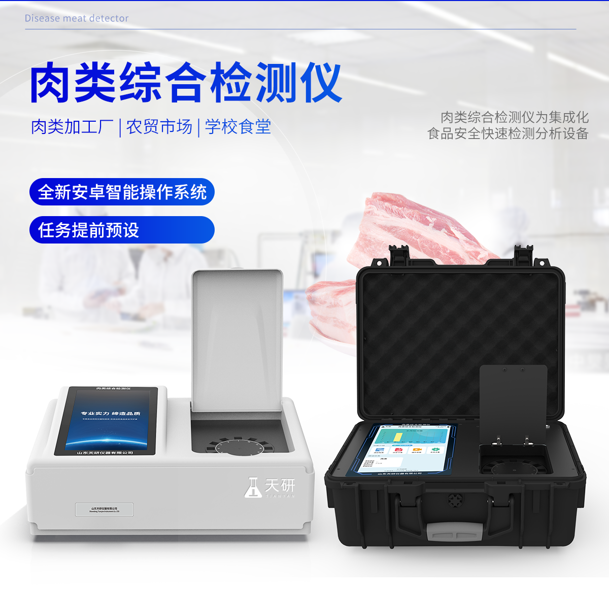 產(chǎn)品詳情:產(chǎn)品介紹: 便攜式肉制品安全檢測(cè)儀可快速檢測(cè)幾十種項(xiàng)目,包含各種獸藥殘留:抗生素類(lèi)殘留、瘦肉精激素類(lèi)殘留;病害肉診斷:肉類(lèi)新鮮度、肉中組胺、揮發(fā)性鹽基氮;水產(chǎn)品安全篩查等現(xiàn)場(chǎng)的定性定量檢測(cè)。 該便攜式肉類(lèi)檢測(cè)儀為集成化肉品安全快速檢測(cè)分析設(shè)備,廣泛應(yīng)用于養(yǎng)殖場(chǎng)、屠宰場(chǎng)、食品肉產(chǎn)