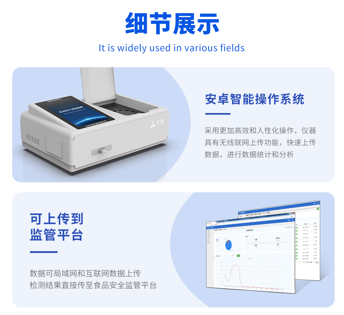 | 儀器采用手提式一體化系統(tǒng)檢測(cè)技術(shù),將分光光度模塊、膠體金檢測(cè)模塊、新型農(nóng)殘檢測(cè)模塊、數(shù)字化管理模塊、無(wú)線(xiàn)通訊模塊高度集成于一體,支持檢測(cè)200種食品安全檢測(cè)項(xiàng)目,同時(shí)預(yù)留升級(jí)檢測(cè)方法。 | 儀器檢測(cè)模塊標(biāo)準(zhǔn)化、智能化,檢測(cè)項(xiàng)目可隨意自由組合。檢測(cè)箱體內(nèi)置多個(gè)標(biāo)準(zhǔn)檢測(cè)單元,檢測(cè)模塊可以調(diào)整配置。 | 顯示屏幕:儀器采用10.1英寸豎向液晶觸摸屏顯,搭配運(yùn)行安卓智能操作系統(tǒng),主控芯片采用ARM Cortex-A7,RK3288/4核處理器,主頻1.88Ghz,操作方便,性能更強(qiáng)。 | 檢測(cè)通道:≥12通道;采用精密旋轉(zhuǎn)比色池設(shè)計(jì),使用同芯片同光源校準(zhǔn)精度,解決不同光源之間的誤差值,更加準(zhǔn)確**。(1-12通道間誤差0.1%,**號(hào):ZL202022821055.2) | 儀器光源:高精度進(jìn)口四波長(zhǎng)冷光源,每個(gè)通道均配置 410、520、590、630nm 波長(zhǎng)光源,標(biāo)配**的光路切換裝置,**光路切換功能可實(shí)現(xiàn)64波長(zhǎng),并且所有檢測(cè)項(xiàng)目可實(shí)現(xiàn)所有通道同時(shí)檢測(cè)。 | 設(shè)備可一鍵校準(zhǔn),自動(dòng)保存校準(zhǔn)數(shù)據(jù),自動(dòng)對(duì)比校驗(yàn),得到精準(zhǔn)光源,采用Android SP存儲(chǔ)數(shù)據(jù),光源數(shù)據(jù)永不丟失,方便每一次使用。 | 通訊接口:配備無(wú)線(xiàn)通信模塊、4G(APN)通訊模塊、藍(lán)牙傳輸,同時(shí)具有雙USB接口以及RJ45網(wǎng)線(xiàn)接口,可以多方式實(shí)現(xiàn)數(shù)據(jù)保存及數(shù)據(jù)傳輸 | 存儲(chǔ)方式:支持U盤(pán)存儲(chǔ),標(biāo)準(zhǔn)USB接口,免驅(qū)動(dòng)安裝。檢測(cè)結(jié)果存儲(chǔ)容量20萬(wàn)條以上,可生成Excel表格進(jìn)行拷貝,并具有登錄保護(hù)功能。 | 智能化操作系統(tǒng): | 1)操作系統(tǒng):儀器可在同一檢測(cè)界面自動(dòng)對(duì)應(yīng)相關(guān)檢測(cè)通道,一次性選擇1-12個(gè)樣品名稱(chēng),無(wú)需退出界面,節(jié)省操作時(shí)間。并可以對(duì)每個(gè)通道屬性和樣品信息單獨(dú)進(jìn)行編輯,例如送檢單位、人員,檢測(cè)人員等,打印時(shí)勾選打印顯示。 | 2)數(shù)據(jù)集成系統(tǒng):設(shè)備首頁(yè)自動(dòng)匯總分析檢測(cè)數(shù)據(jù),包含:周檢測(cè)數(shù)據(jù)、月檢測(cè)數(shù)據(jù),全部檢測(cè)總數(shù)量,均包含檢測(cè)總數(shù),合格數(shù),不合格數(shù),以及相關(guān)柱形分析圖,各項(xiàng)檢測(cè)數(shù)據(jù)一目了然,無(wú)需電腦查詢(xún),更加快捷直觀(guān)。 | 3)數(shù)據(jù)庫(kù)系統(tǒng):十幾項(xiàng)數(shù)據(jù)庫(kù)分類(lèi)管理儀器:包含項(xiàng)目類(lèi)型、項(xiàng)目數(shù)據(jù)、檢測(cè)數(shù)據(jù)、歷史記錄、國(guó)標(biāo)信息、曲線(xiàn)信息、采樣信息、檢測(cè)信息、受檢信息、復(fù)核信息、圖表信息、光源校準(zhǔn)信息、打印樣式信息、樣品庫(kù)信息等等,數(shù)據(jù)庫(kù)之間互相協(xié)調(diào)聯(lián)動(dòng)保證數(shù)據(jù)的真實(shí)完整性。同時(shí)產(chǎn)品數(shù)據(jù)庫(kù)以及歷史檢測(cè)記錄支持一鍵檢索功能。 | 4)限量規(guī)判系統(tǒng):具有限量查詢(xún)、添加物質(zhì)合規(guī)判定系統(tǒng)。檢測(cè)出結(jié)果后,系統(tǒng)自動(dòng)調(diào)用系統(tǒng)數(shù)據(jù)庫(kù)中相關(guān)國(guó)標(biāo)進(jìn)行比對(duì)判定,客觀(guān)顯示判定結(jié)果是否合格。 | 5)項(xiàng)目預(yù)設(shè)系統(tǒng):儀器具有任務(wù)預(yù)設(shè)模塊,一鍵提前預(yù)設(shè),給出方便快捷的新檢測(cè)方案,每一個(gè)任務(wù)分別可以設(shè)置不同的樣品、批次、編號(hào)、來(lái)源、備注、抽樣信息、檢測(cè)信息、受檢信息、復(fù)核信息等更多信息。樣品送檢時(shí)一鍵調(diào)取保存信息,并可多次調(diào)取,大大提高檢測(cè)效率。 | 6)數(shù)據(jù)監(jiān)管系統(tǒng):同步對(duì)接監(jiān)管平臺(tái),數(shù)據(jù)可局域網(wǎng)和互聯(lián)網(wǎng)數(shù)據(jù)上傳,檢測(cè)結(jié)果可選擇直接傳至食品安全監(jiān)管平臺(tái)。進(jìn)行區(qū)域食品安全監(jiān)管及大數(shù)據(jù)分析處理與數(shù)據(jù)統(tǒng)計(jì),檢測(cè)區(qū)域食品安全長(zhǎng)短期動(dòng)態(tài),達(dá)到食品安全問(wèn)題預(yù)估、預(yù)警。 | 7)打印系統(tǒng):內(nèi)置全新打印機(jī),新創(chuàng)自定義打印方式,可按需靈活勾選控制:產(chǎn)品合格證(國(guó)家農(nóng)業(yè)部標(biāo)準(zhǔn)要求),二維碼,抽樣信息、檢測(cè)信息,受檢信息、復(fù)核信息、抽樣日期、檢測(cè)日期等信息的打印。 | 供電模式:儀器交直流兩用,直流12V供電,可連接車(chē)載電源,可配6ah大容量充電鋰電池,電量可實(shí)時(shí)顯示,方便戶(hù)外流動(dòng)測(cè)試。 | 膠體金檢測(cè)模塊:采用雙通道CMOS成像處理技術(shù)及膠體金免疫層析技術(shù),可同時(shí)讀取雙膠體金卡數(shù)據(jù),自動(dòng)采集、處理分析,將檢測(cè)結(jié)果顯示,并可根據(jù)參考限值自動(dòng)判斷檢測(cè)結(jié)果,可檢測(cè)常見(jiàn)的獸藥殘留、生物毒素、抗生素、違禁添加物等。 | 1)探測(cè)技術(shù):CMOS成像探測(cè); | 2)