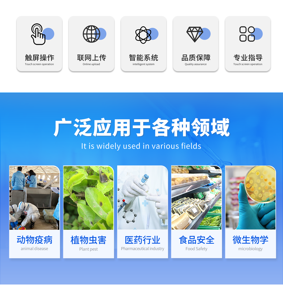 | 瘦肉精激素類(獸藥):鹽酸克倫特羅、沙丁胺醇、萊克多巴胺、己烯雌酚、喹乙醇等 | 抗生素殘留類(獸藥):四環素類、硝基呋喃類、磺胺類、沙星類、喹諾酮類、慶大霉素、鏈霉素、阿莫西林、紅霉素等 | 水產品安全類:孔雀石綠、氯霉素、呋喃妥因代謝、呋喃西林代謝、呋喃它酮代謝、呋喃唑酮代謝等 | 以及病害肉及肉類新鮮度的擴展檢測。 |