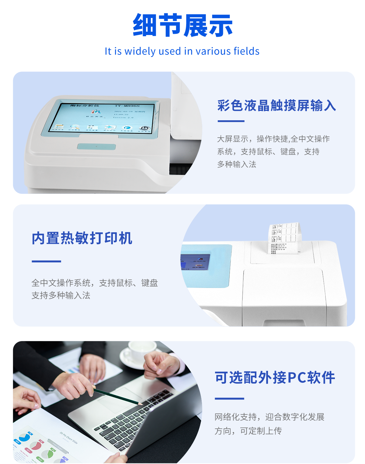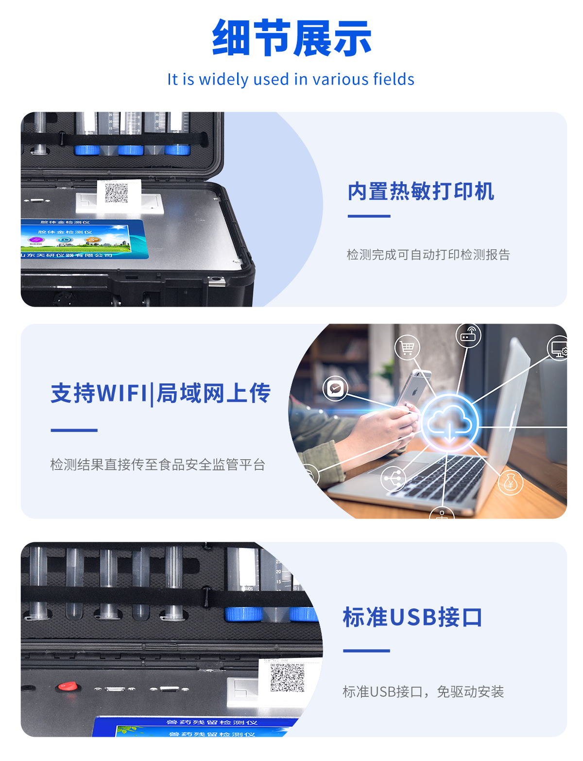 | 安卓智能操作系統,采用更加**UI交互界面,儀器具有wifi聯網上傳、4G聯網傳輸、GPRS無線遠傳、網線連接功能,快速批量上傳數據。 | 智能化程度高,儀器具有自檢功能:具有開機自檢和調零功能,具有自動檢測重復性功能。 | 新一代高速熱敏打印機,檢測完成可自動打印檢測報告和二維碼。 | 儀器帶有監管平臺,數據可局域網和互聯網數據上傳,檢測結果直接傳至食品安全監管平臺。進行區域食品安全監管及大數據分析處理與數據統計,檢測區域食品安全長短期動態,達到食品安全問題預估、預警 | 一體化便攜式快檢設備,滿足現場及流動檢測使用需求,能夠在同一軟件下實現所有檢測項目的檢測,并可通過同一窗口直觀顯示檢測結果。 | 膠體金模塊檢測方式:軌道式自動傳輸掃描,檢測完成后自動退出檢測卡。 | 一體化主機,包含食品安全檢測模塊、多通道農藥殘留檢測模塊、膠體金免疫層析檢測模塊。 | CT線自動識別,無需手動調整。 | 儀器具有品類多種類樣品菜單庫,可靈活選擇檢測樣品,不同的檢測通道可同時檢測不同的樣品項目。。 | 樣品處理簡單省力,整體操作快速、安全、便捷。 | 儀器具有自身保護功能,可設置用戶名及密碼,防止非工作人員操作等。 | 高靈敏度,高檢測精度,高重復性精度,掃描式高精度光學傳感器。 | 儀器具有重新校準、鎖定、恢復出廠設置功能。 | 內置強大的數據庫,可在儀器上直接選擇樣品名稱、檢測指標、送檢單位等信息,也可在儀器上直接編輯錄入樣品名稱、檢測指標、送檢單位等信息并保存進樣品數據庫。 | 儀器具有重新校準、鎖定、恢復出廠設置功能。 | 結果判定線可修改,對照值標定值可保存,斷電不丟失數據。 | 兼容市場上所有的膠體金卡,使用耗材不受限制,極大增強用戶使用體驗。 |