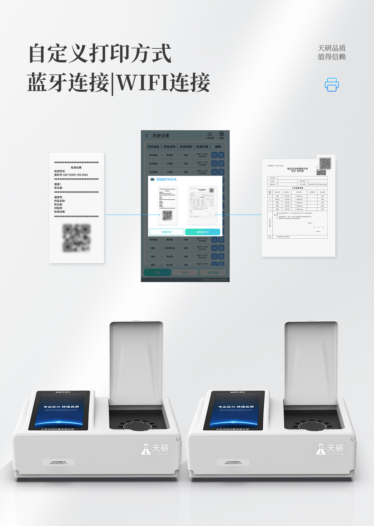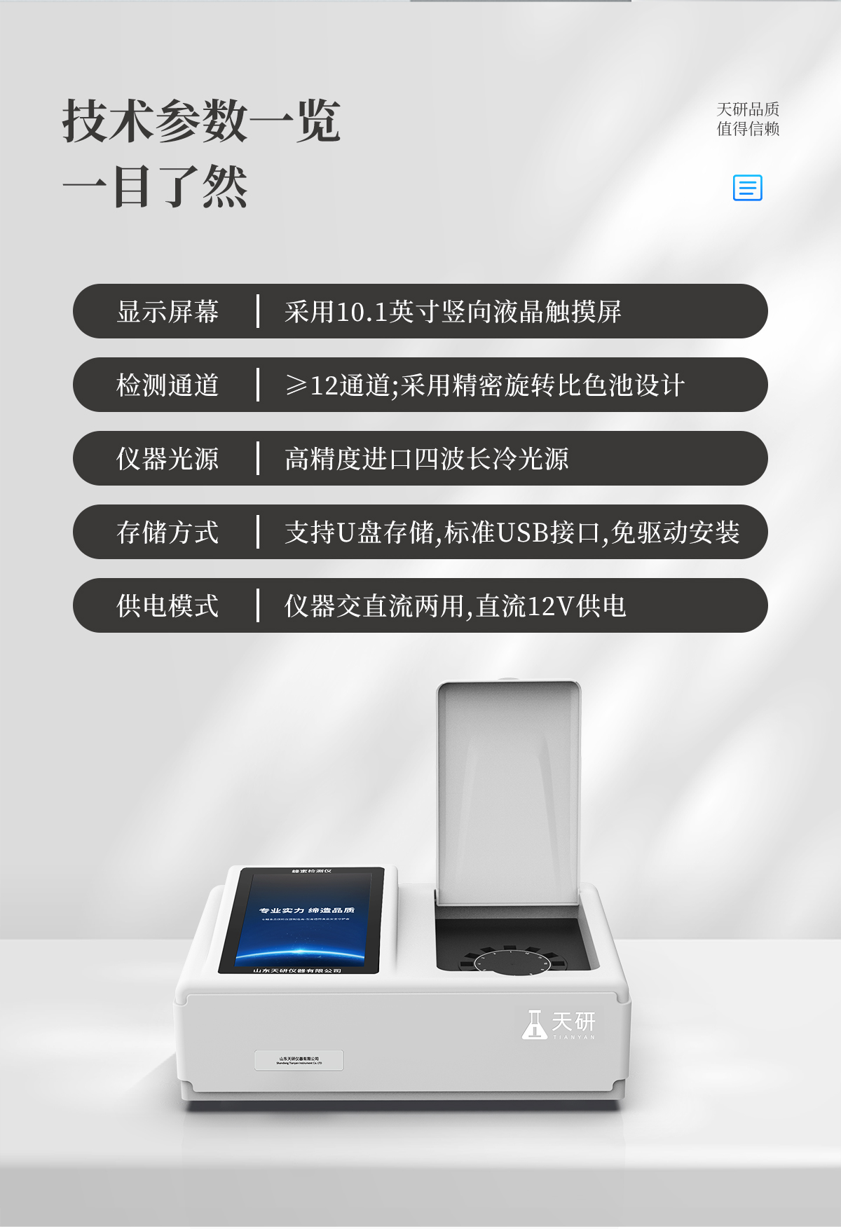| 儀器采用臺式一體化系統檢測技術,將分光光度模塊、數字化管理模塊、無線通訊模塊高度集成于一體,支持檢測200種食品安全檢測項目,同時預留升級檢測方法。 | 儀器檢測模塊標準化、智能化,檢測項目可隨意自由組合。檢測箱體內置多個標準檢測單元,檢測模塊可以調整配置。 | 顯示屏幕:儀器采用10.1英寸豎向液晶觸摸屏顯,搭配運行安卓智能操作系統,主控芯片采用ARM Cortex-A7,RK3288/4核處理器,主頻1.88Ghz,操作方便,性能更強。 | 檢測通道:≥12通道;采用精密旋轉比色池設計,使用同芯片同光源校準精度,解決不同光源之間的誤差值,更加準確**。(1-12通道間誤差0.1%,**號:ZL202022821055.2) | 儀器光源:高精度進口四波長冷光源,每個通道均配置 410、520、590、630nm 波長光源,標配**的光路切換裝置,**光路切換功能可實現64波長,并且所有檢測項目可實現所有通道同時檢測。 | 設備可一鍵校準,自動保存校準數據,自動對比校驗,得到精準光源,采用Android SP存儲數據,光源數據永不丟失,方便每一次使用。 | 通訊接口:配備無線通信模塊、可選配4G(APN)通訊模塊和藍牙傳輸,同時具有雙USB接口以及RJ45網線接口,可以多方式實現數據保存及數據傳輸。 | 存儲方式:支持U盤存儲,標準USB接口,免驅動安裝。檢測結果存儲容量20萬條以上,可生成Excel表格進行拷貝,并具有登錄保護功能。 | 智能化操作系統: | 1)操作系統:儀器可在同一檢測界面自動對應相關檢測通道,一次性選擇1-12個樣品名稱,無需退出界面,節省操作時間。并可以對每個通道屬性和樣品信息單獨進行編輯,例如送檢單位、人員,檢測人員等,打印時勾選打印顯示。 | 2)數據集成系統:設備首頁自動匯總分析檢測數據,包含:周檢測數據、月檢測數據,全部檢測總數量,均包含檢測總數,合格數,不合格數,以及相關柱形分析圖,各項檢測數據一目了然,無需電腦查詢,更加快捷直觀。 | 3)數據庫系統:十幾項數據庫分類管理儀器:包含項目類型、項目數據、檢測數據、歷史記錄、國標信息、曲線信息、采樣信息、檢測信息、受檢信息、復核信息、圖表信息、光源校準信息、打印樣式信息、樣品庫信息等等,數據庫之間互相協調聯動保證數據的真實完整性。同時產品數據庫以及歷史檢測記錄支持一鍵檢索功能。 | 4)限量規判系統:具有限量查詢、添加物質合規判定系統。檢測出結果后,系統自動調用系統數據庫中相關國標進行比對判定,客觀顯示判定結果是否合格。 | 5)項目預設系統:儀器具有任務預設模塊,一鍵提前預設,給出方便快捷的新檢測方案,每一個任務分別可以設置不同的樣品、批次、編號、來源、備注、抽樣信息、檢測信息、受檢信息、復核信息等更多信息。樣品送檢時一鍵調取保存信息,并可多次調取,大大提高檢測效率。 | 6)數據監管系統:同步對接監管平臺,數據可局域網和互聯網數據上傳,檢測結果可選擇直接傳至食品安全監管平臺。進行區域食品安全監管及大數據分析處理與數據統計,檢測區域食品安全長短期動態,達到食品安全問題預估、預警。 | 7)打印系統:內置全新打印機,新創自定義打印方式,可按需靈活勾選控制:產品合格證(國家農業部標準要求),二維碼,抽樣信息、檢測信息,受檢信息、復核信息、抽樣日期、檢測日期等信息的打印。 | 供電模式:儀器交直流兩用,直流12V供電,可連接車載電源,可配6ah大容量充電鋰電池,電量可實時顯示,方便戶外流動測試。 | 儀器加入遠程升級功能,可定向分客戶分儀器更新,開機后自動更新,客戶無需任何操作,即可升級全新項目。做到了無需退換機器即可實現實時遠程升級檢測儀器。 | 設備尺寸:(長*寬*高)440*300*180mm | 儀器加入遠程升級功能,可定向分客戶分儀器更新,開機后自動更新,客戶無需任何操作,即可升級全新項目。做到了無需退換機器即可實現實時遠程升級檢測儀器。 |