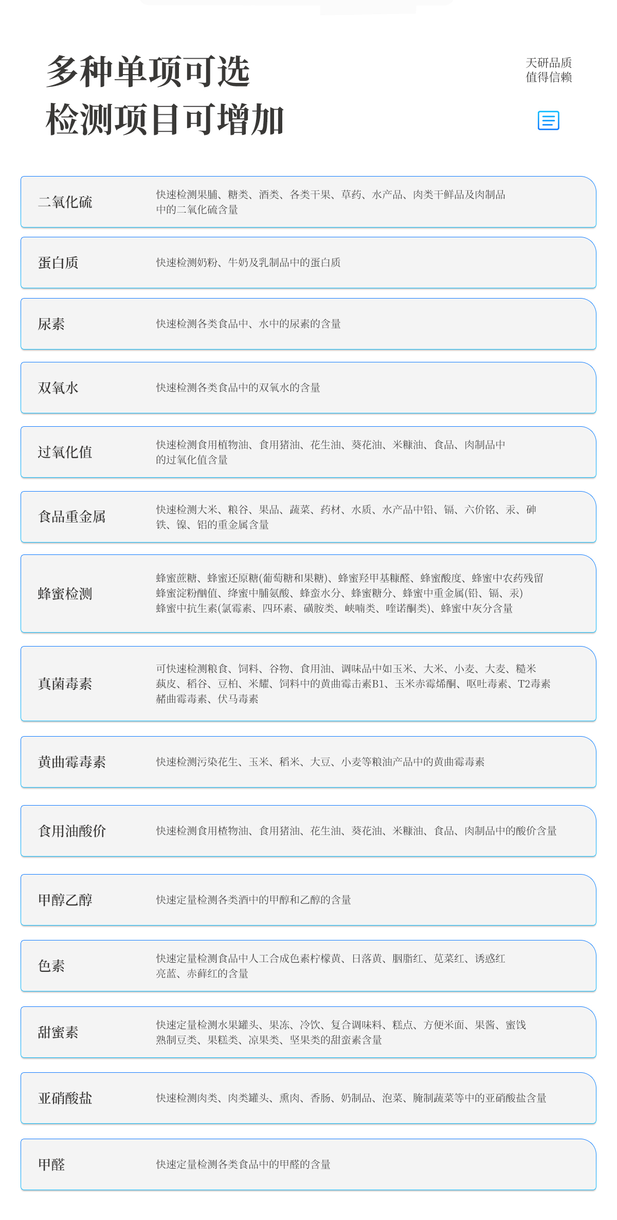 | 食品添加劑:二氧化硫、雙氧水、亞硝酸鹽、硝酸鹽、苯甲酸鈉、山梨酸鉀、糖精鈉、甜蜜素、木耳硫酸鎂等 | 有毒有害物質:甲醛、吊白塊、硼砂、過氧化苯甲酰、溴酸鉀、羅丹明B、三聚氰胺、蘇丹紅、工業堿、尿素、明礬等 | 食用油脂:過氧化值、酸價等 | 果蔬:農藥殘留(酶抑制率法) | 病害肉:組胺、揮發性鹽基氮 | 重金屬含量:鉛、鎘、鉻、汞、砷、錫、鎳、鋁等 | 水酒飲品分析:酒中甲醇、乙醇、乳品及牛奶中蛋白質, | 蜂蜜成分:果糖和葡萄糖、蔗糖、淀粉酶、酸度等 | 調味品成分:食醋的總酸、醬油的總酸、芝麻油純度、谷氨酸鈉、醬油氨基酸態氮、食鹽中亞鐵氰化鉀、食鹽中碘等 | 食用色素類:紅色色素(胭脂紅、莧菜紅、莧菜紅)、黃色色素(檸檬黃、日落黃)、藍色色素(亮藍)等 |