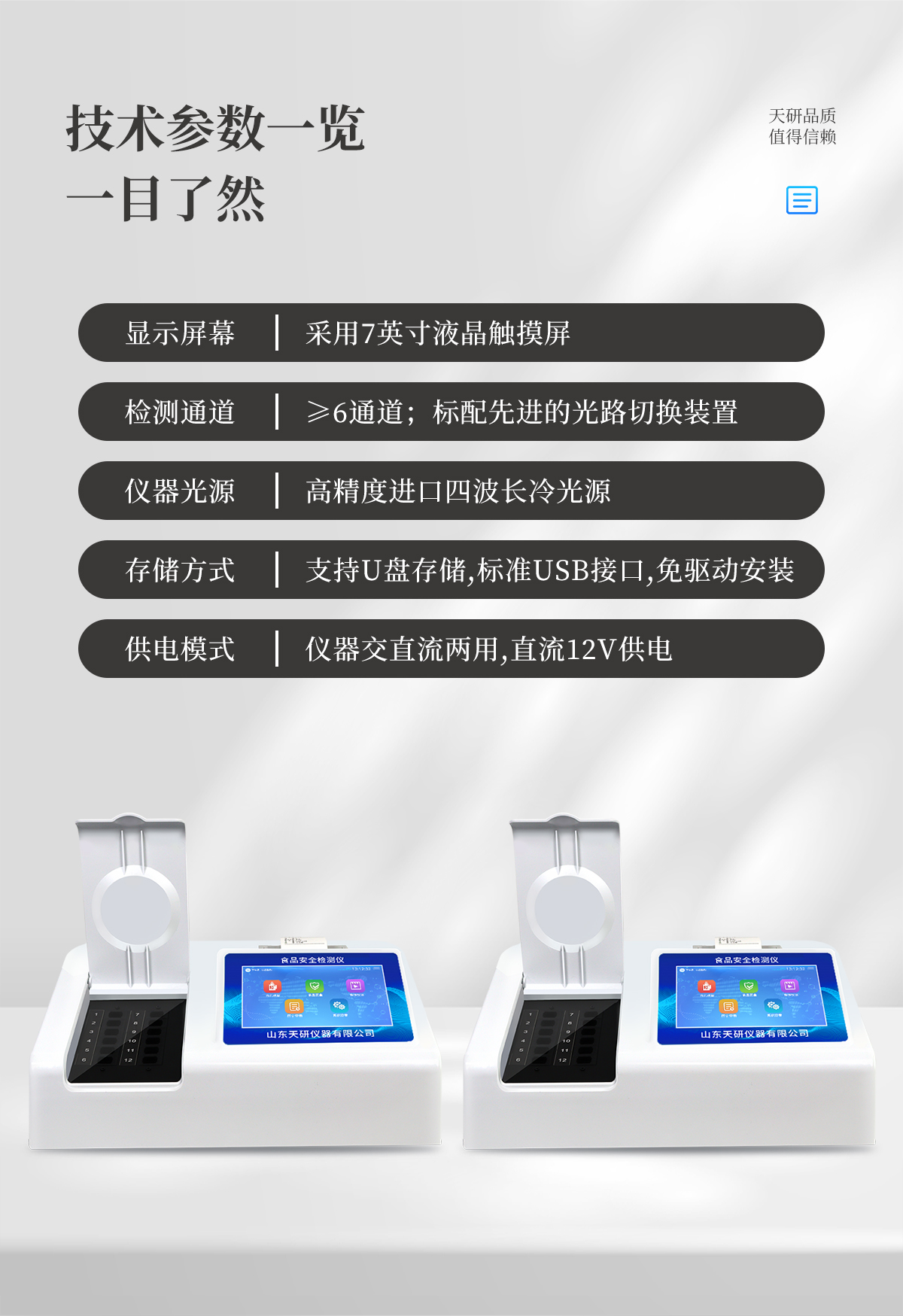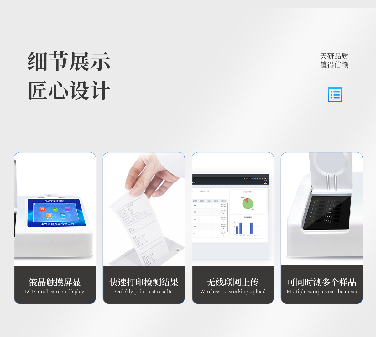 | 安卓智能操作系統,采用更加**和人性化操作,儀器具有網線連接、wifi聯網上傳、GPRS無線遠傳功能,快速上傳數據。 | 智能化程度高,儀器具有自檢功能:具有開機自檢和調零功能,具有自動檢測重復性功能。 | 檢測通道:≥12個檢測通道,可以同時測試多個樣品,每個樣品由程序控制分別獨立工作,不會互相干擾。 | 顯示方式:≥8英寸液晶觸摸屏顯示,人性化中文操作界面,讀數直觀、簡單。 | 配備新一代嵌入式熱敏打印機,可選擇手動打印或者自動打印,檢測完成可自動打印檢測報告和二維碼。 | 光源采用進口超高亮發光二極管,高精度、穩定性強、光源可控、可以關掉不使用的光源,功耗更低。 | 采用USB2.0接口設計,方便數據的存貯和移動,并可隨時與計算機直接相連,并且可用計算機控制儀器。實現數據查詢、瀏覽、分析、統計、打印等。 | 儀器帶有監管平臺。數據可局域網和互聯網數據上傳,檢測結果直接傳至食品安全監管平臺。進行區域食品安全監管及大數據分析處理,檢測區域食品安全長短期動態,達到食品安全問題預估、預警 | 一體化便攜式快檢設備,滿足現場及流動檢測使用需求,能夠在同一軟件下實現所有檢測項目的檢測,并可通過同一窗口直觀顯示檢測結果。 | 儀器具有多品類多種類樣品菜單庫,可靈活選擇檢測樣品,不同的檢測通道可同時檢測不同的樣品項目。也可在儀器上直接編輯錄入樣品名稱、檢測指標、送檢單位等信息并保存進樣品數據庫。 | 樣品處理簡單省力,整體操作快速、安全、便捷。 | 儀器具有自身保護功能,可設置用戶名及密碼,防止非工作人員操作等。 | 高靈敏度,高檢測精度,高重復性精度,掃描式高精度光學傳感器。 | 儀器具有重新校準、鎖定、恢復出廠設置功能。 | 支持U盤存儲。 結果判定線可修改,對照值標定值可保存,斷電不丟失數據。 |