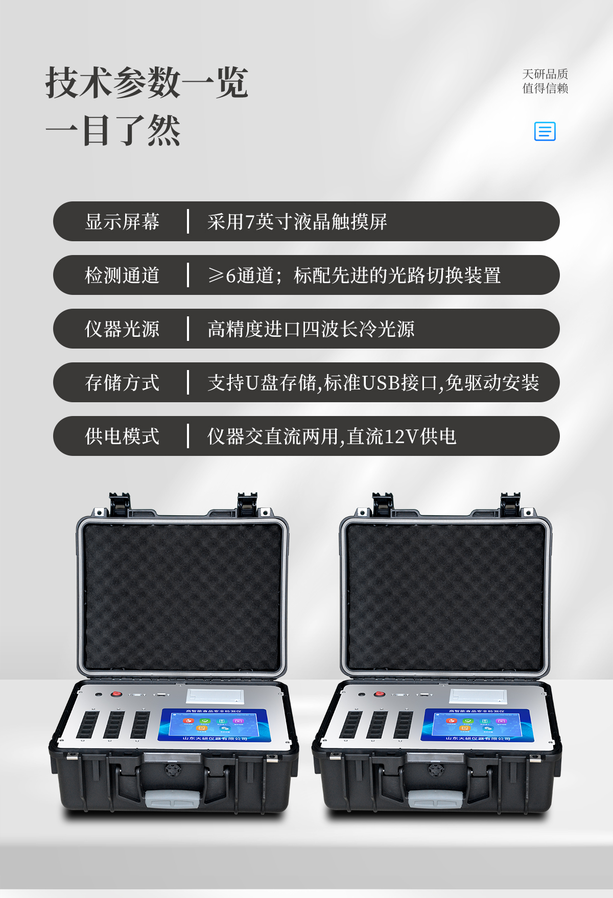 | 主控芯片采用ARM Cortex-A7,RK3288/4核處理器,主頻1.88Ghz,運轉速度更快速,穩定性更強。 | 顯示方式:7英寸液晶觸摸屏顯示,人性化中文操作界面,讀數直觀、簡單。 | 交直流兩用,直流12V供電,可連接車載電源,可配6ah大容量充電鋰電池,方便戶外流動測試。 | 四波長冷光源,6個檢測通道,每個通道均配置410、520、590、630nm波長光源,標配**的光路切換裝置,專業光路切換功能可實現*多64波長,并且所有檢測項目可實現所有通道同時檢測。 | 智能恒流穩壓,光強自動調節與校準,長時間連續工作光源無溫漂現象。 | 內置新國家限量標準,與所測結果進行現場比對,并持續更新標準。 | 不間斷進樣,連續檢測 | 樣本編號自動累加。 | 數據無線上傳平臺,并可從平臺導出為Excel表格。 | 檢測結果存儲容量20萬條 | 同時支持U盤拷貝,標準USB接口,免驅動插拔。 | 檢測項目可擴充,固件可升級 | 儀器尺寸:43×35×19cm, 主機凈重:5.1kg |