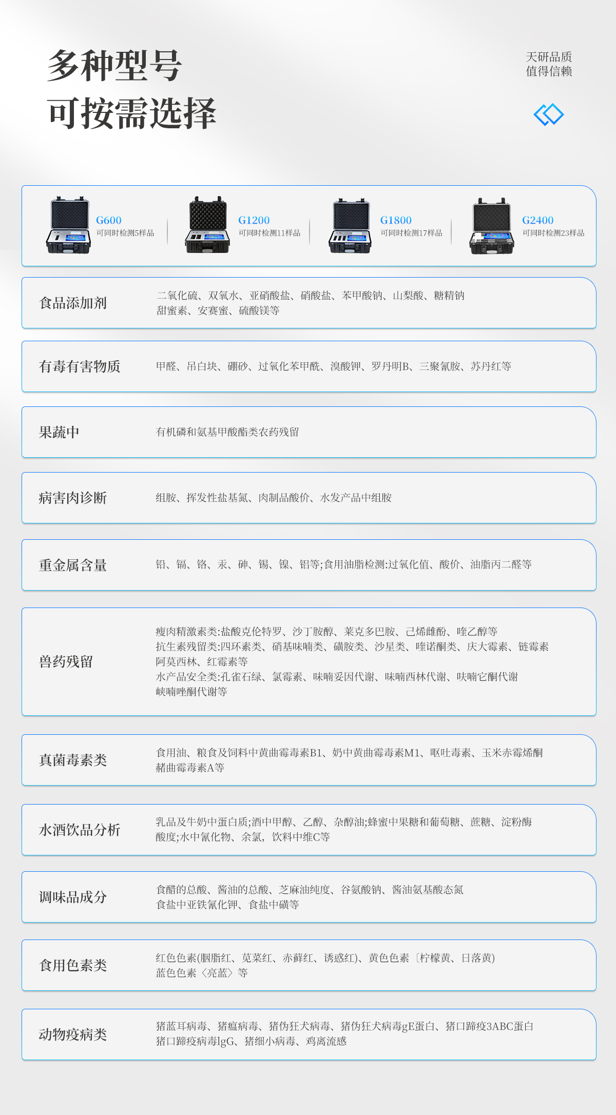 | 食品添加劑:二氧化硫、雙氧水、亞硝酸鹽、硝酸鹽、苯甲酸鈉、山梨酸、糖精鈉、甜蜜素、安賽蜜、硫酸鎂等 | 有毒有害物質:甲醛、吊白塊、硼砂、過氧化苯甲酰、溴酸鉀、羅丹明B、三聚氰胺、蘇丹紅等 | 果蔬中:有機磷和氨基甲酸酯類農藥殘留; | 病害肉診斷:組胺、揮發性鹽基氮、肉制品酸價、水發產品中組胺 | 重金屬含量:鉛、鎘、鉻、汞、砷、錫、鎳、鋁等;食用油脂檢測:過氧化值、酸價、油脂丙二醛等。 | 瘦肉精激素類(獸藥):鹽酸克倫特羅、沙丁胺醇、萊克多巴胺、己烯雌酚、喹乙醇等 | 抗生素殘留類(獸藥):四環素類、硝基呋喃類、磺胺類、沙星類、喹諾酮類、慶大霉素、鏈霉素、阿莫西林、紅霉素等 | 水產品安全類:孔雀石綠、氯霉素、呋喃妥因代謝、呋喃西林代謝、呋喃它酮代謝、呋喃唑酮代謝等 | 真菌毒素類:食用油、糧食及飼料中黃曲霉毒素B1、奶中黃曲霉毒素M1、嘔吐毒素、玉米赤霉烯酮、赭曲霉毒素A等 | 水酒飲品分析:乳品及牛奶中蛋白質;酒中甲醇、乙醇、雜醇油;蜂蜜中果糖和葡萄糖、蔗糖、淀粉酶、酸度;水中氰化物、余氯,飲料中維C等 | 調味品成分:食醋的總酸、醬油的總酸、芝麻油純度、谷氨酸鈉、醬油氨基酸態氮、食鹽中亞鐵氰化鉀、食鹽中碘等 | 食用色素類:紅色色素(胭脂紅、莧菜紅、赤蘚紅、誘惑紅)、黃色色素(檸檬黃、日落黃)、藍色色素(亮藍)等 | 動物疫病類:豬藍耳病毒、豬瘟病毒、豬偽狂犬病毒、豬偽狂犬病毒gE蛋白、豬口蹄疫3ABC蛋白、豬口蹄疫病毒IgG、豬細小病毒、雞禽流感等 |
