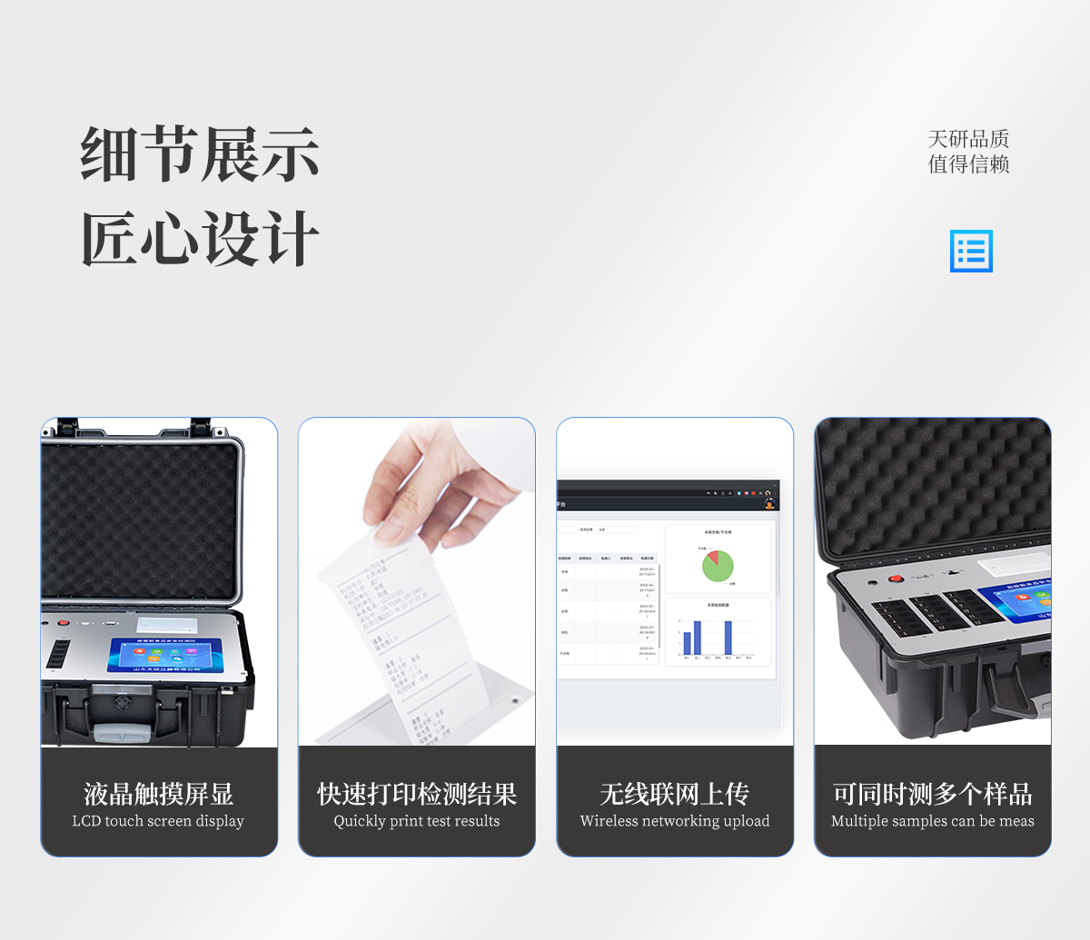 | 安卓智能操作系統,采用更加**的UI交互界面,儀器具有wifi聯網上傳、4G聯網傳輸、GPRS無線遠傳、網線連接功能,快速批量上傳數據。 | 智能化程度高,儀器具有自檢功能:具有開機自檢和調零功能,具有自動檢測重復性功能。 | 新一代高速熱敏打印機,檢測完成可自動打印或批量打印檢測報告和二維碼。 | 儀器帶有監管平臺,數據可局域網和互聯網數據上傳,檢測結果直接傳至食品安全監管平臺。進行區域食品安全監管及大數據分析處理與數據統計,檢測區域食品安全長短期動態,達到食品安全問題預估、預警 | 一體化主機,包含食品安全檢測模塊、多通道農藥殘留檢測模塊、膠體金免疫層析檢測模塊。 | 一體化便攜式快檢設備,滿足現場及流動檢測使用需求,能夠在同一軟件下實現所有檢測項目的檢測,并可通過同一窗口直觀顯示檢測結果。 | 膠體金模塊檢測方式:軌道式自動傳輸掃描,檢測完成后自動退出檢測卡。 | CT線自動識別,無需手動調整。 | 內置強大的數據庫,具有多品類多種類樣品菜單功能,可靈活選擇檢測樣品,不同的檢測通道可同時檢測不同的樣品項目。也可在儀器上直接編輯錄入樣品名稱、檢測指標、送檢單位等信息并保存進樣品數據庫。 | 產品內置操作演示視頻,是您身邊的化驗指導專家。 | 樣品處理簡單省力,整體操作快速、安全、便捷。 | 儀器具有自身保護功能,可設置用戶名及密碼,防止非工作人員操作等。 | 高靈敏度,高檢測精度,高重復性精度,掃描式高精度光學傳感器。 | 結果判定線可修改,對照值標定值可保存,斷電不丟失數據。 | 兼容市場上所有的膠體金卡,使用耗材不受限制,極大增強用戶使用體驗。 | 儀器具有重新校準、鎖定、恢復出廠設置功能。 |