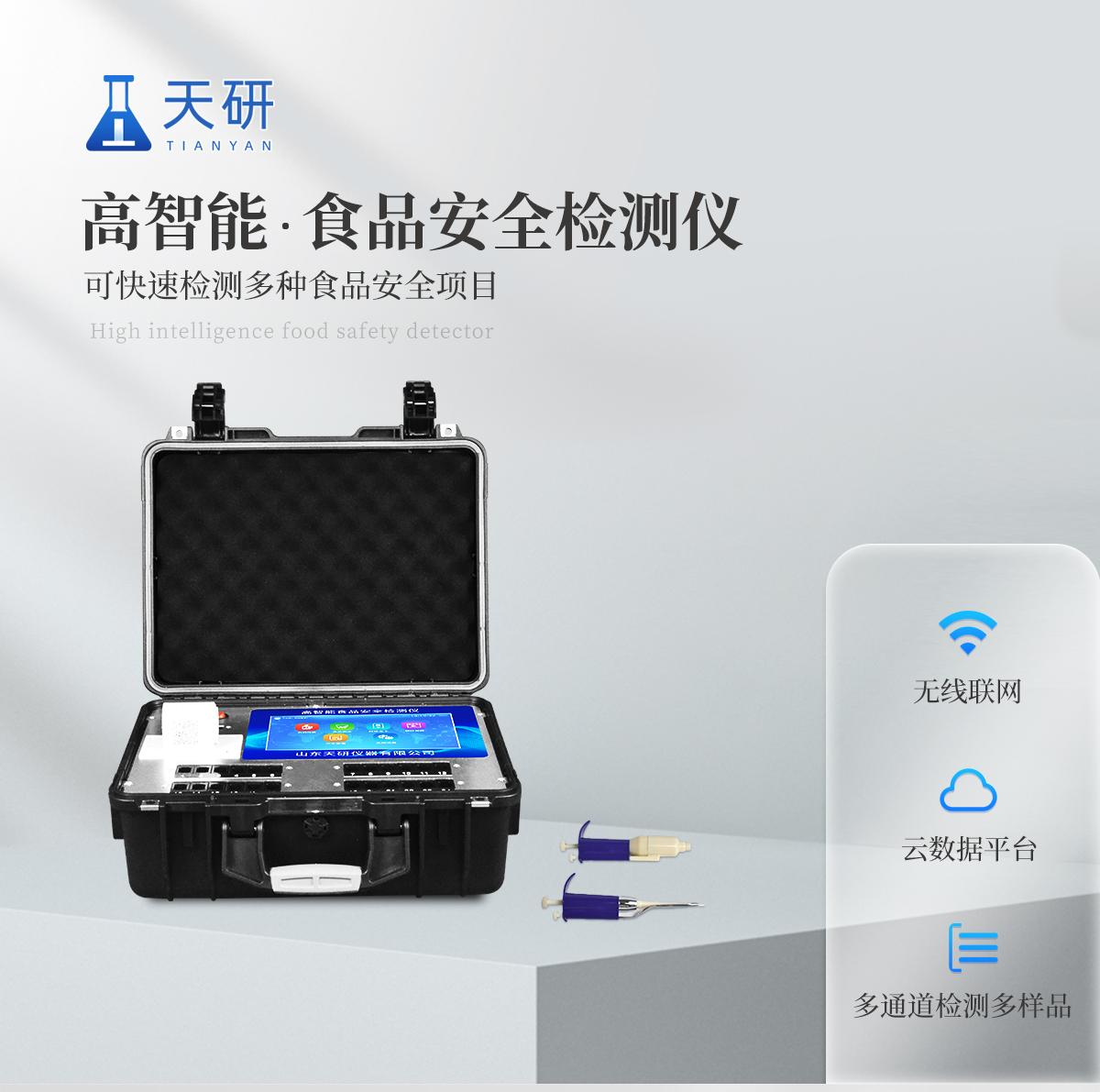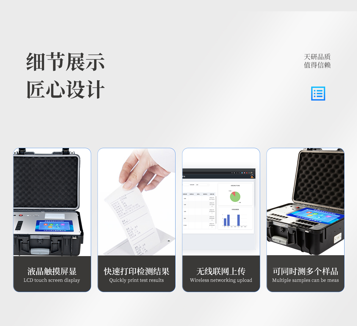 | 安卓智能操作系統,采用更加**的UI交互界面,儀器具有wifi聯網上傳、4G聯網傳輸、GPRS無線遠傳、網線連接功能,快速批量上傳數據。 | 智能化程度高,儀器具有自檢功能:具有開機自檢和調零功能,具有自動檢測重復性功能。 | 新一代高速熱敏打印機,檢測完成可自動打印或批量打印檢測報告和二維碼。 | 儀器帶有監管平臺,數據可局域網和互聯網數據上傳,檢測結果直接傳至食品安全監管平臺。進行區域食品安全監管及大數據分析處理與數據統計,檢測區域食品安全長短期動態,達到食品安全問題預估、預警 | 一體化主機,包含食品安全檢測模塊、多通道農藥殘留檢測模塊、膠體金免疫層析檢測模塊。 | 一體化便攜式快檢設備,滿足現場及流動檢測使用需求,能夠在同一軟件下實現所有檢測項目的檢測,并可通過同一窗口直觀顯示檢測結果。 | 膠體金模塊檢測方式:軌道式自動傳輸掃描,檢測完成后自動退出檢測卡。 | CT線自動識別,無需手動調整。 | 內置強大的數據庫,具有多品類多種類樣品菜單功能,可靈活選擇檢測樣品,不同的檢測通道可同時檢測不同的樣品項目。也可在儀器上直接編輯錄入樣品名稱、檢測指標、送檢單位等信息并保存進樣品數據庫。 | 產品內置操作演示視頻,是您身邊的化驗指導專家。 | 樣品處理簡單省力,整體操作快速、安全、便捷。 | 儀器具有自身保護功能,可設置用戶名及密碼,防止非工作人員操作等。 | 高靈敏度,高檢測精度,高重復性精度,掃描式高精度光學傳感器。 | 結果判定線可修改,對照值標定值可保存,斷電不丟失數據。 | 兼容市場上所有的膠體金卡,使用耗材不受限制,極大增強用戶使用體驗。 | 儀器具有重新校準、鎖定、恢復出廠設置功能。 |