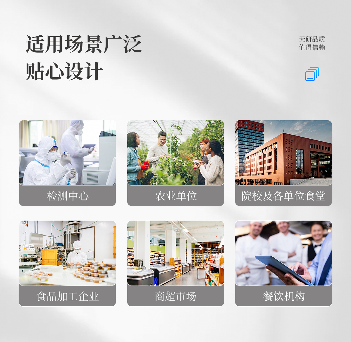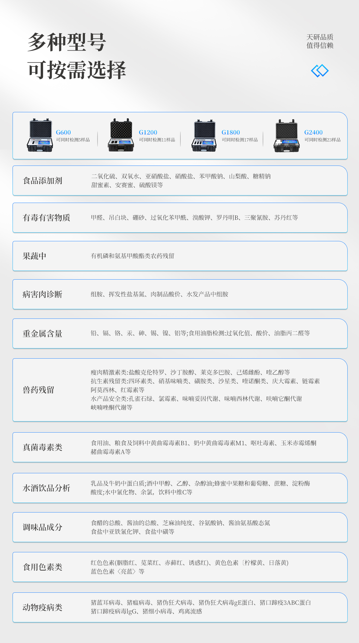 | 食品添加劑:二氧化硫、雙氧水、亞硝酸鹽、硝酸鹽、苯甲酸鈉、山梨酸、糖精鈉、甜蜜素、安賽蜜、硫酸鎂等 | 有毒有害物質:甲醛、吊白塊、硼砂、過氧化苯甲酰、溴酸鉀、羅丹明B、三聚氰胺、蘇丹紅等 | 果蔬中:有機磷和氨基甲酸酯類農藥殘留; | 病害肉診斷:組胺、揮發性鹽基氮、肉制品酸價、水發產品中組胺 | 重金屬含量:鉛、鎘、鉻、汞、砷、錫、鎳、鋁等;食用油脂檢測:過氧化值、酸價、油脂丙二醛等。 | 瘦肉精激素類(獸藥):鹽酸克倫特羅、沙丁胺醇、萊克多巴胺、己烯雌酚、喹乙醇等 | 抗生素殘留類(獸藥):四環素類、硝基呋喃類、磺胺類、沙星類、喹諾酮類、慶大霉素、鏈霉素、阿莫西林、紅霉素等 | 水產品安全類:孔雀石綠、氯霉素、呋喃妥因代謝、呋喃西林代謝、呋喃它酮代謝、呋喃唑酮代謝等 | 真菌毒素類:食用油、糧食及飼料中黃曲霉毒素B1、奶中黃曲霉毒素M1、嘔吐毒素、玉米赤霉烯酮、赭曲霉毒素A等 | 水酒飲品分析:乳品及牛奶中蛋白質;酒中甲醇、乙醇、雜醇油;蜂蜜中果糖和葡萄糖、蔗糖、淀粉酶、酸度;水中氰化物、余氯,飲料中維C等 | 調味品成分:食醋的總酸、醬油的總酸、芝麻油純度、谷氨酸鈉、醬油氨基酸態氮、食鹽中亞鐵氰化鉀、食鹽中碘等 | 食用色素類:紅色色素(胭脂紅、莧菜紅、赤蘚紅、誘惑紅)、黃色色素(檸檬黃、日落黃)、藍色色素(亮藍)等 | 動物疫病類:豬藍耳病毒、豬瘟病毒、豬偽狂犬病毒、豬偽狂犬病毒gE蛋白、豬口蹄疫3ABC蛋白、豬口蹄疫病毒IgG、豬細小病毒、雞禽流感等 |