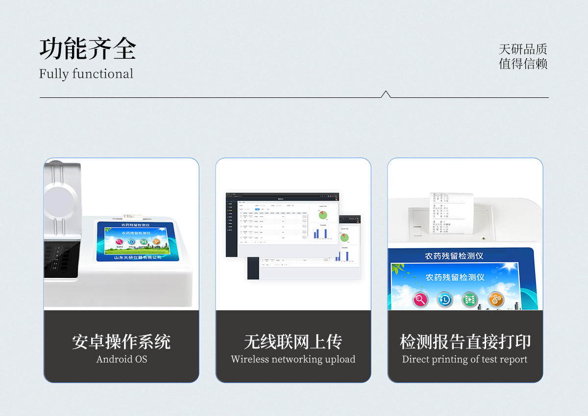 | 安卓智能操作系統,采用更加**和人性化操作,儀器具有無線聯網上傳功能,快速上傳數據,進行數據統計和分析。 | 智能化程度高,儀器具有自檢功能:具有開機自檢和調零功能,具有自動檢測重復性功能;同時,檢測完成可自動打印檢測報告和二維碼。手機掃碼可顯示出詳細檢測信息。 | 儀器帶有監管平臺,數據可局域網和互聯網數據上傳,檢測結果直接傳至食品安全監管平臺。進行區域食品安全監管及大數據分析處理與數據統計,檢測區域食品安全長短期動態,達到食品安全問題預估、預警 。 | 樣品處理簡單省力,整體操作快速、安全、便捷。 | 儀器具有自身保護功能,可設置用戶名及密碼,防止非工作人員操作等。 | 內置強大的數據庫,可在儀器上直接選擇樣品名稱、檢測指標、送檢單位等信息,也可在儀器上直接編輯錄入樣品名稱、檢測指標、送檢單位等信息并保存進樣品數據庫,方便后期操作調取使用。 | 儀器具有重新校準、鎖定、恢復出廠設置功能。 |