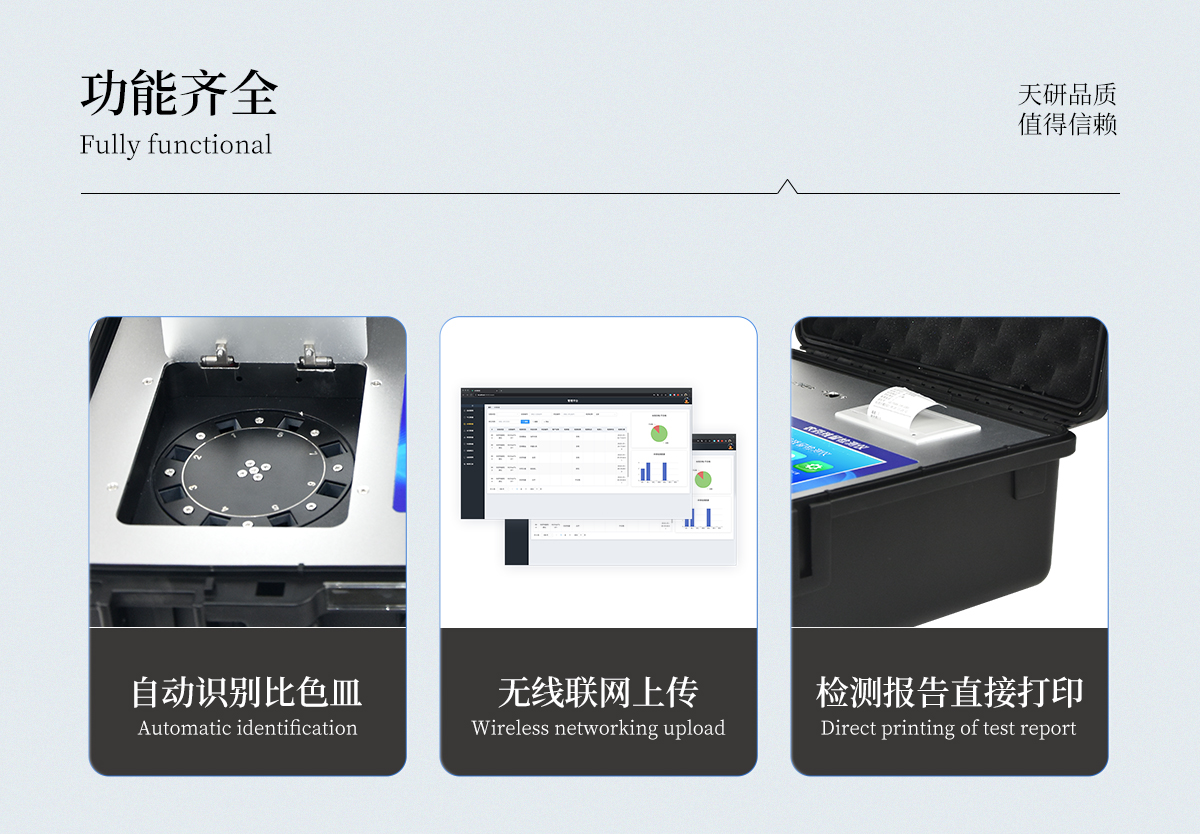 | 安卓智能操作系統(tǒng),采用更加**和人性化操作,儀器具有無(wú)線聯(lián)網(wǎng)上傳功能,快速上傳數(shù)據(jù),進(jìn)行數(shù)據(jù)統(tǒng)計(jì)和分析。 | 智能化程度高,儀器具有自檢功能:具有開(kāi)機(jī)自檢和調(diào)零功能,具有自動(dòng)檢測(cè)重復(fù)性功能;同時(shí),檢測(cè)完成可自動(dòng)打印檢測(cè)報(bào)告和二維碼。手機(jī)掃碼可顯示出詳細(xì)檢測(cè)信息。 | 儀器帶有監(jiān)管平臺(tái),數(shù)據(jù)可局域網(wǎng)和互聯(lián)網(wǎng)數(shù)據(jù)上傳,檢測(cè)結(jié)果直接傳至食品安全監(jiān)管平臺(tái)。進(jìn)行區(qū)域食品安全監(jiān)管及大數(shù)據(jù)分析處理與數(shù)據(jù)統(tǒng)計(jì),檢測(cè)區(qū)域食品安全長(zhǎng)短期動(dòng)態(tài),達(dá)到食品安全問(wèn)題預(yù)估、預(yù)警 。 | 樣品處理簡(jiǎn)單省力,整體操作快速、安全、便捷。 | 儀器具有自身保護(hù)功能,可設(shè)置用戶(hù)名及密碼,防止非工作人員操作等。 | 內(nèi)置強(qiáng)大的數(shù)據(jù)庫(kù),可在儀器上直接選擇樣品名稱(chēng)、檢測(cè)指標(biāo)、送檢單位等信息,也可在儀器上直接編輯錄入樣品名稱(chēng)、檢測(cè)指標(biāo)、送檢單位等信息并保存進(jìn)樣品數(shù)據(jù)庫(kù),方便后期操作調(diào)取使用。 | 儀器具有重新校準(zhǔn)、鎖定、恢復(fù)出廠設(shè)置功能。 |