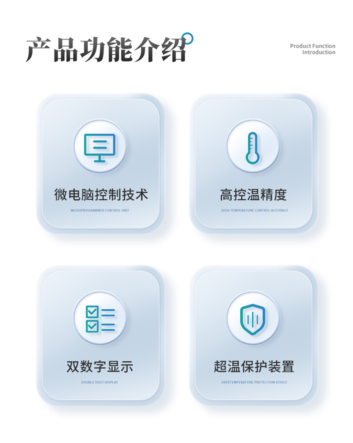 | 分配室上各氣針通道可組合使用或單獨使用,每一路氣針均可單獨開關。分配室的高度可視需要調節。 | 每一路氣體流量可單獨進行調節,克服了不可調氮吹儀各氣路氣流量大小不一的弱點。 | 數字溫控器,雙數字顯示. | 可能與溶劑接觸的部件均采用不銹鋼材料、合金鋁并表面進行塑料噴涂,使用壽命長且清潔方便。 | 整機可放入通風櫥中使用。 | 一般標配的加熱塊規格為孔徑∮16mm。 |