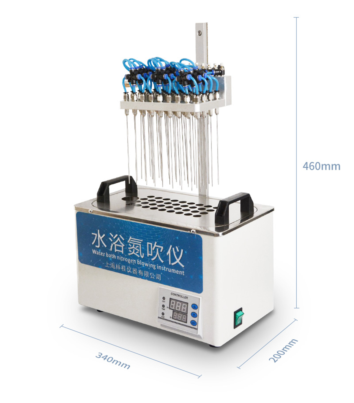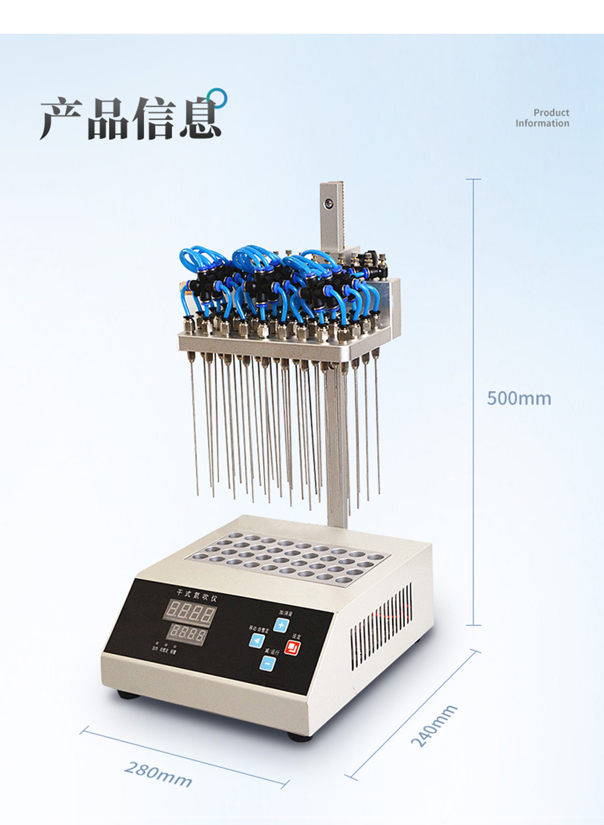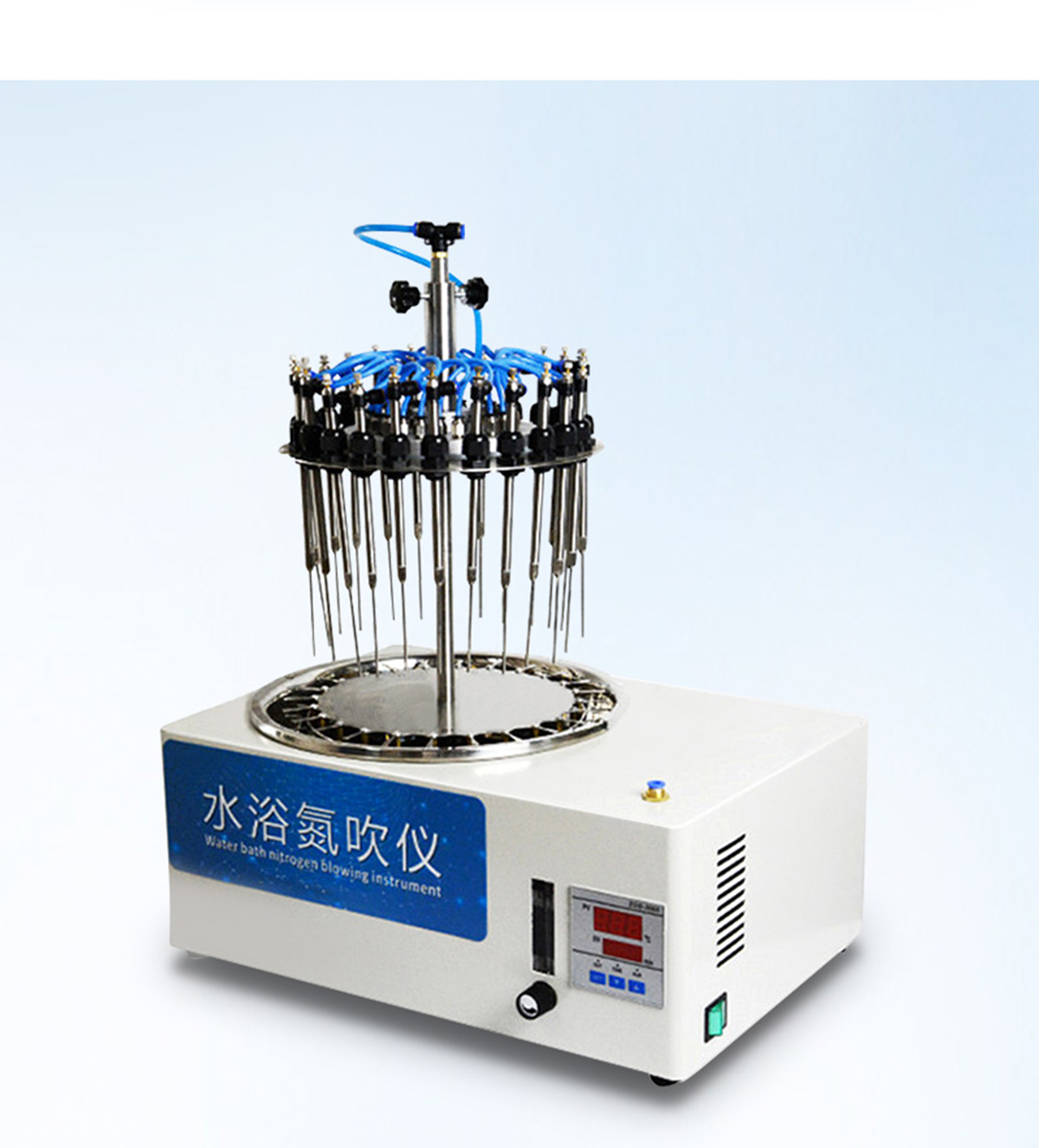 | 每個吹針都可以獨立控制,避免引起交叉污染。 | 儀器氣腔高度可以自行調節,配備標準氣針長度為15厘米。 | 氮吹儀有36個氣道控制開關,節約氣體,每根吹氣針的位置可獨立改變吹掃位置,使之適用不同的樣品容器及不同的樣品位置 | 在濃縮有毒溶劑時,整個系統可置于通風柜中,降低危險。 | 內置超溫保護裝置,自動故障檢測及報警功能,方便實用。 | 儀器有LED顯示屏,溫度同步顯示、時間遞減顯示,可時時觀察溫度變化。 | 具有整體溫度更均勻,加熱速度快 | 本產品還可以作為普通的干式恒溫器使用 | 使用起來更簡便,而且溫度也可以達到150℃,可以更好濃縮樣品 |