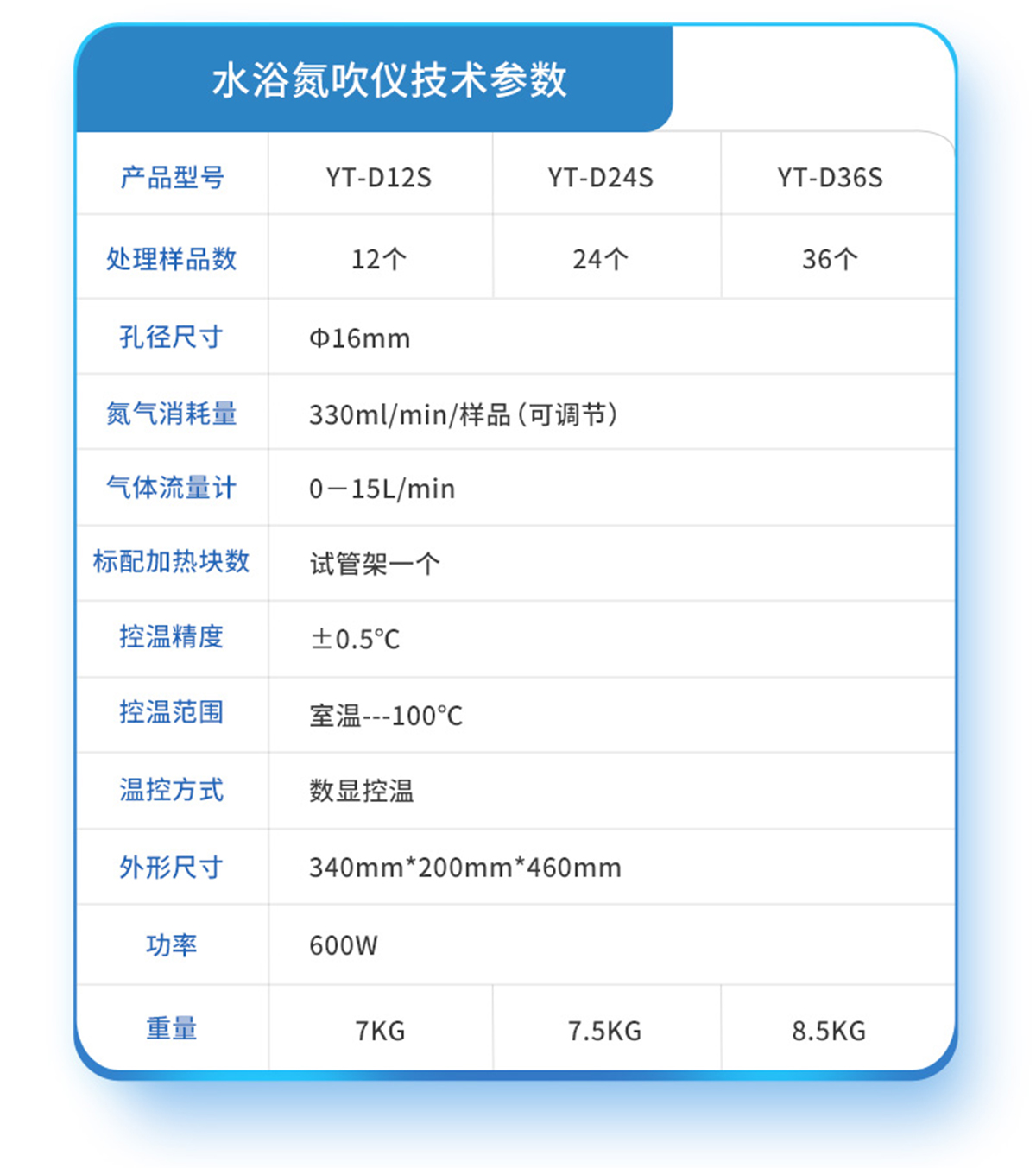| YT-D12(12孔) | 12個 | Ф16mm | 150W | 0-15L/min | 試管架一個 | ±0.5℃ | 室溫+5℃~150℃ | 數顯控溫 | 280mm*240mm*500mm | 7KG |