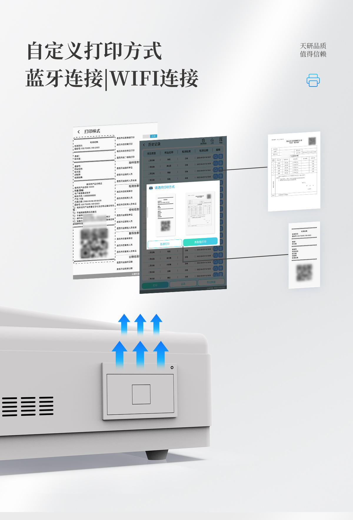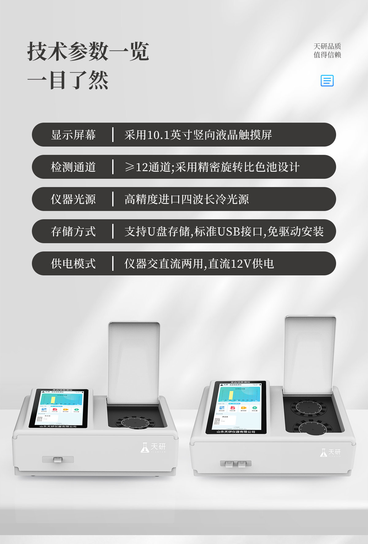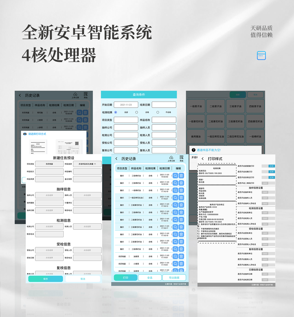 | 儀器采用臺式一體化系統(tǒng)檢測技術(shù),將分光光度模塊、新型農(nóng)殘檢測模塊、數(shù)字化管理模塊、無線通訊模塊高度集成于一體,支持檢測200種食品安全檢測項目,同時預(yù)留升級檢測方法。 | 儀器檢測模塊標準化、智能化,可隨意自由組合。檢測箱體內(nèi)置多個標準檢測單元,檢測模塊可以調(diào)整配置。 | 儀器采用全新安卓智能系統(tǒng),主控芯片采用 ARM Cortex-A7,RK3288/4核處理器,10.1寸高清液晶觸摸豎屏,更加**的UI交互界面,運轉(zhuǎn)快捷;儀器配備無線通信模塊: 4G(APN)通訊模塊、Wifi模塊,藍牙傳輸,同時具有雙USB接口以及RJ45接口能以多種方式實現(xiàn)數(shù)據(jù)保存和數(shù)據(jù)傳輸功能。 | 創(chuàng)新檢測模式: | ★檢測通道:≥12通道;采用精密旋轉(zhuǎn)比色池設(shè)計,使用同芯片同光源校準精度,解決不同光源之間的誤差值。1-12通道間誤差0.1%。(**號:ZL202022821055.2) | ★儀器具有自動識別比色皿檢測功能,即:將樣品比色皿放入儀器后,點擊樣品檢測,儀器自動識別比色皿進行通道檢測。 | 進口高精光源: | 高精度進口四波長冷光源,通道配置 410、520、590、630nm 波長光源,一個光源芯片驅(qū)動一個光源,誤差極小,每臺設(shè)備單獨**校準光源,**比對,同時參照四種不同波段光源全方位覆蓋市面上99%的農(nóng)殘食品項目檢測。 | 智能化操作系統(tǒng): | 便捷操作系統(tǒng):設(shè)備檢測時可在同一檢測界面自動對應(yīng)相關(guān)檢測通道一次性選擇1-12個樣品名稱,無須退出界面,節(jié)省操作時間。 | 數(shù)據(jù)集成系統(tǒng):設(shè)備首頁自動統(tǒng)計檢測數(shù)據(jù)包含:周檢測數(shù)據(jù)、月檢測數(shù)據(jù),全部檢測總數(shù)量,均包含檢測總數(shù),合格數(shù),不合格數(shù),以及相關(guān)柱形分析圖,對各項檢測數(shù)據(jù)清晰掌握,無需電腦查詢,更加快捷直觀。 | 項目預(yù)設(shè)系統(tǒng):支持添加單個及多個相同或不相同的任務(wù)預(yù)設(shè),一鍵快速調(diào)取,每一個任務(wù)分別可以設(shè)置不同的樣品、批次、編號、來源、備注、抽樣信息、檢測信息、受檢信息、復(fù)核信息等更多信息。無縫鏈接平臺和APP實時查看下發(fā)任務(wù)。 | 數(shù)據(jù)監(jiān)管系統(tǒng):同步對接監(jiān)管平臺,數(shù)據(jù)可局域網(wǎng)和互聯(lián)網(wǎng)數(shù)據(jù)上傳,檢測結(jié)果可選擇直接傳至食品安全監(jiān)管平臺。集成OSS輸出存儲服務(wù)、區(qū)分設(shè)備定向管理應(yīng)用,進行區(qū)域食品安全監(jiān)管及大數(shù)據(jù)分析處理與數(shù)據(jù)統(tǒng)計,檢測區(qū)域食品安全長短期動態(tài),達到食品安全問題預(yù)估、預(yù)警。 | 自定義打印系統(tǒng):內(nèi)置全新打印系統(tǒng),新創(chuàng)自定義打印方式,可按需靈活設(shè)置開啟或關(guān)閉:產(chǎn)品合格證(國家農(nóng)業(yè)部標準要求),二維碼,抽樣信息、檢測信息,受檢信息、復(fù)核信息、抽樣日期、檢測日期等信息的打印。 | 系統(tǒng)遠程更新功能:可定向分客戶分儀器更新系統(tǒng),按照不同客戶后期實際需求添加項目,無需機器返廠,即可遠程實時升級全新系統(tǒng),節(jié)省時間成本及避免運輸造成設(shè)備損壞。 | 儀器主機采用一體化防水、抗壓、防撞擊、防腐蝕箱體設(shè)計,同時配備交直流供電,可連接車載電源,可選配大容量充電鋰電池,滿足現(xiàn)場野外檢測需求。 | 安全證書,放心保障:儀器具有中國計量科學(xué)研究院校準證書,**認證。 |