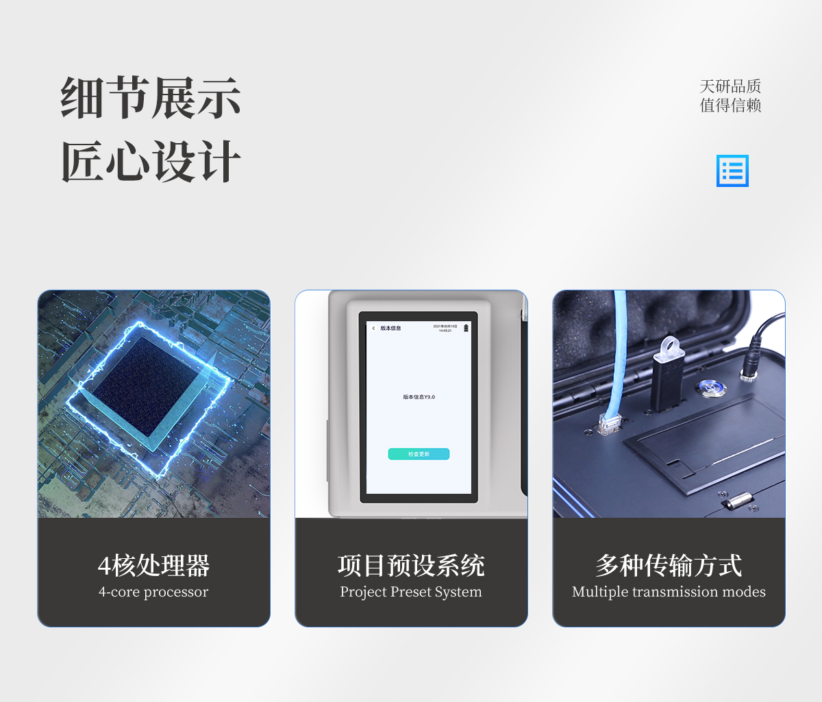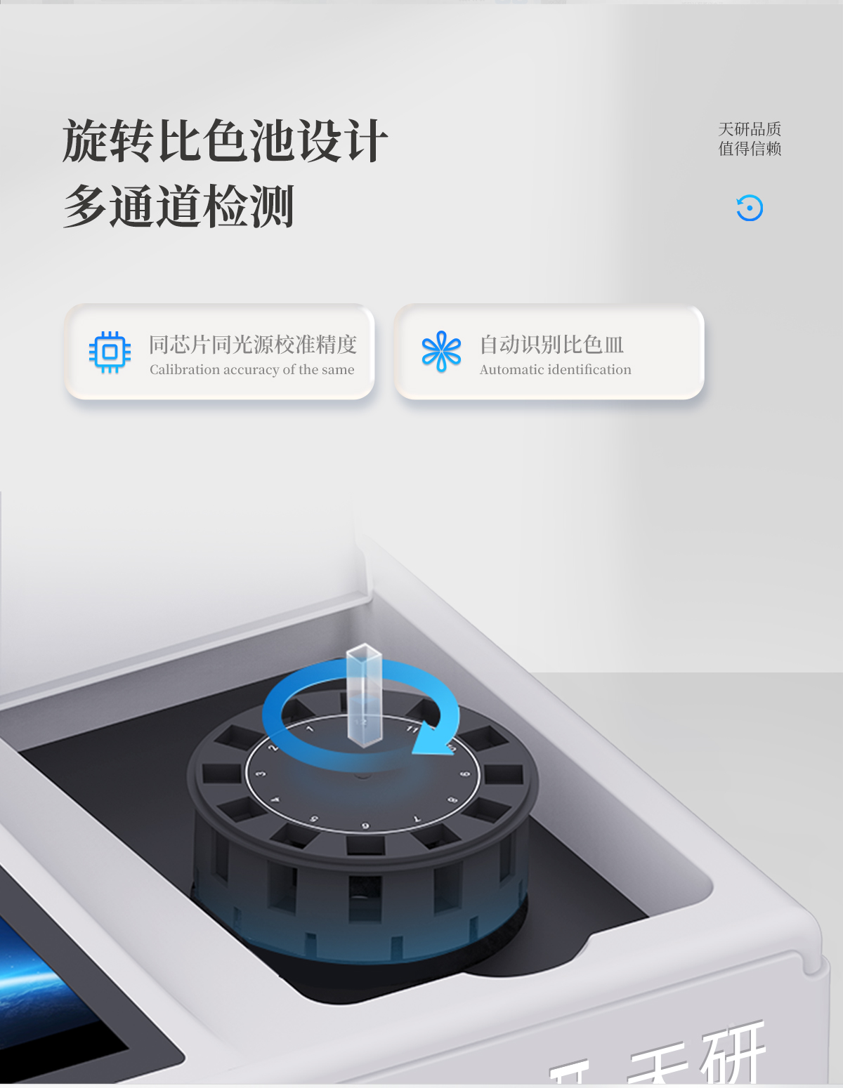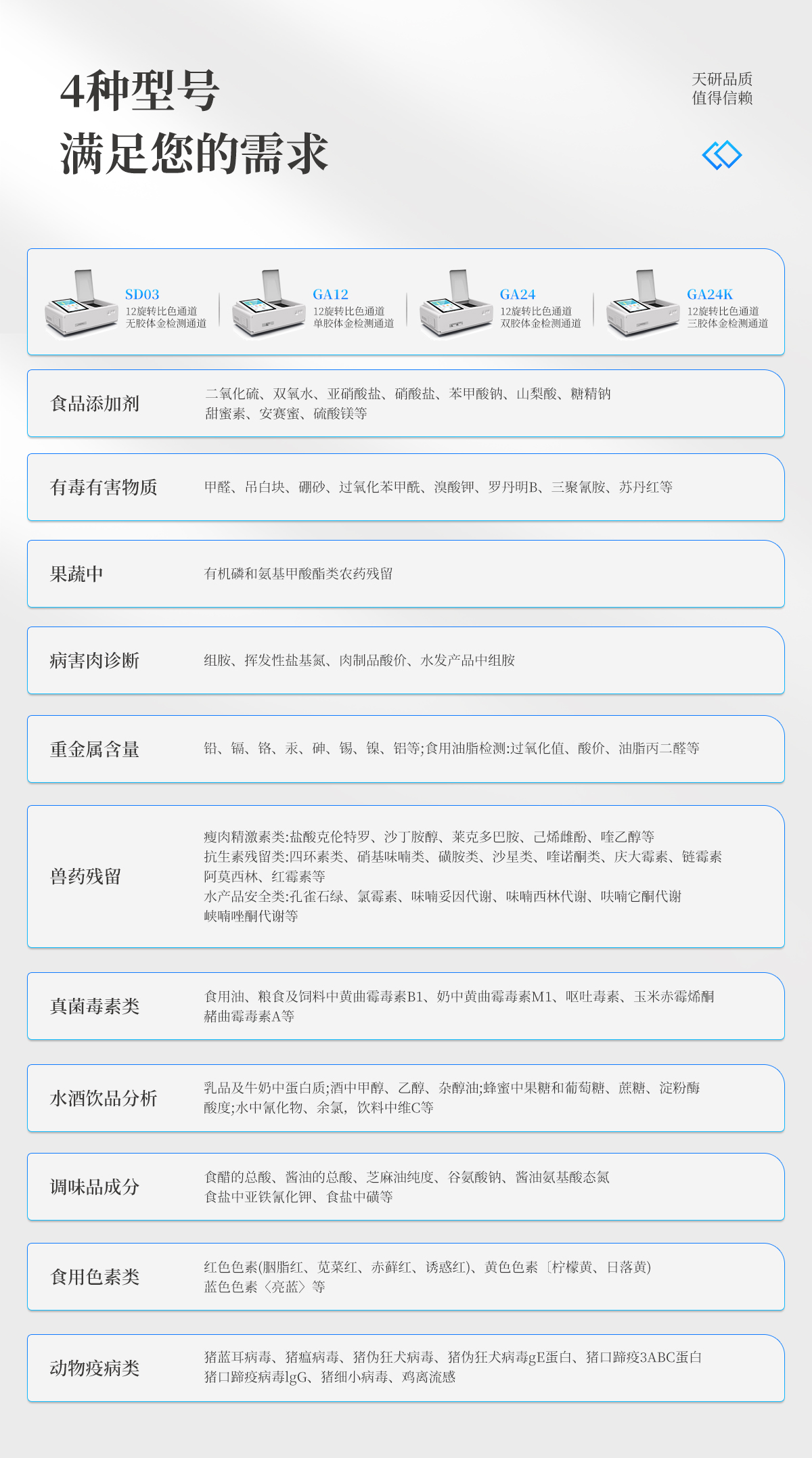 | 儀器采用臺式一體化系統(tǒng)檢測技術(shù),將分光光度模塊、新型農(nóng)殘檢測模塊、數(shù)字化管理模塊、無線通訊模塊高度集成于一體,支持檢測200種食品安全檢測項目,同時預(yù)留升級檢測方法。 | 儀器檢測模塊標準化、智能化,可隨意自由組合。檢測箱體內(nèi)置多個標準檢測單元,檢測模塊可以調(diào)整配置。 | 儀器采用全新安卓智能系統(tǒng),主控芯片采用 ARM Cortex-A7,RK3288/4核處理器,10.1寸高清液晶觸摸豎屏,更加**的UI交互界面,運轉(zhuǎn)快捷;儀器配備無線通信模塊: 4G(APN)通訊模塊、Wifi模塊,藍牙傳輸,同時具有雙USB接口以及RJ45接口能以多種方式實現(xiàn)數(shù)據(jù)保存和數(shù)據(jù)傳輸功能。 | 創(chuàng)新檢測模式: | ★檢測通道:≥12通道;采用精密旋轉(zhuǎn)比色池設(shè)計,使用同芯片同光源校準精度,解決不同光源之間的誤差值。1-12通道間誤差0.1%。(**號:ZL202022821055.2) | ★儀器具有自動識別比色皿檢測功能,即:將樣品比色皿放入儀器后,點擊樣品檢測,儀器自動識別比色皿進行通道檢測。 | 進口高精光源: | 高精度進口四波長冷光源,通道配置 410、520、590、630nm 波長光源,一個光源芯片驅(qū)動一個光源,誤差極小,每臺設(shè)備單獨**校準光源,**比對,同時參照四種不同波段光源全方位覆蓋市面上99%的農(nóng)殘食品項目檢測。 | 智能化操作系統(tǒng): | 便捷操作系統(tǒng):設(shè)備檢測時可在同一檢測界面自動對應(yīng)相關(guān)檢測通道一次性選擇1-12個樣品名稱,無須退出界面,節(jié)省操作時間。 | 數(shù)據(jù)集成系統(tǒng):設(shè)備首頁自動統(tǒng)計檢測數(shù)據(jù)包含:周檢測數(shù)據(jù)、月檢測數(shù)據(jù),全部檢測總數(shù)量,均包含檢測總數(shù),合格數(shù),不合格數(shù),以及相關(guān)柱形分析圖,對各項檢測數(shù)據(jù)清晰掌握,無需電腦查詢,更加快捷直觀。 | 項目預(yù)設(shè)系統(tǒng):支持添加單個及多個相同或不相同的任務(wù)預(yù)設(shè),一鍵快速調(diào)取,每一個任務(wù)分別可以設(shè)置不同的樣品、批次、編號、來源、備注、抽樣信息、檢測信息、受檢信息、復(fù)核信息等更多信息。無縫鏈接平臺和APP實時查看下發(fā)任務(wù)。 | 數(shù)據(jù)監(jiān)管系統(tǒng):同步對接監(jiān)管平臺,數(shù)據(jù)可局域網(wǎng)和互聯(lián)網(wǎng)數(shù)據(jù)上傳,檢測結(jié)果可選擇直接傳至食品安全監(jiān)管平臺。集成OSS輸出存儲服務(wù)、區(qū)分設(shè)備定向管理應(yīng)用,進行區(qū)域食品安全監(jiān)管及大數(shù)據(jù)分析處理與數(shù)據(jù)統(tǒng)計,檢測區(qū)域食品安全長短期動態(tài),達到食品安全問題預(yù)估、預(yù)警。 | 自定義打印系統(tǒng):內(nèi)置全新打印系統(tǒng),新創(chuàng)自定義打印方式,可按需靈活設(shè)置開啟或關(guān)閉:產(chǎn)品合格證(國家農(nóng)業(yè)部標準要求),二維碼,抽樣信息、檢測信息,受檢信息、復(fù)核信息、抽樣日期、檢測日期等信息的打印。 | 系統(tǒng)遠程更新功能:可定向分客戶分儀器更新系統(tǒng),按照不同客戶后期實際需求添加項目,無需機器返廠,即可遠程實時升級全新系統(tǒng),節(jié)省時間成本及避免運輸造成設(shè)備損壞。 | 儀器主機采用一體化防水、抗壓、防撞擊、防腐蝕箱體設(shè)計,同時配備交直流供電,可連接車載電源,可選配大容量充電鋰電池,滿足現(xiàn)場野外檢測需求。 | 安全證書,放心保障:儀器具有中國計量科學(xué)研究院校準證書,**認證。 |