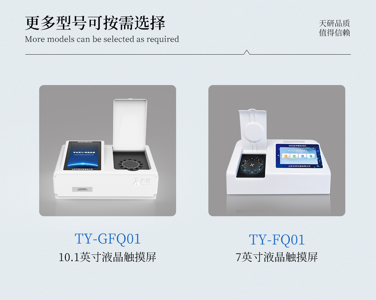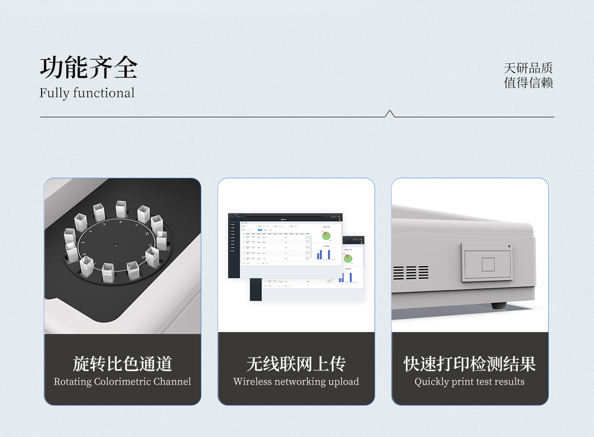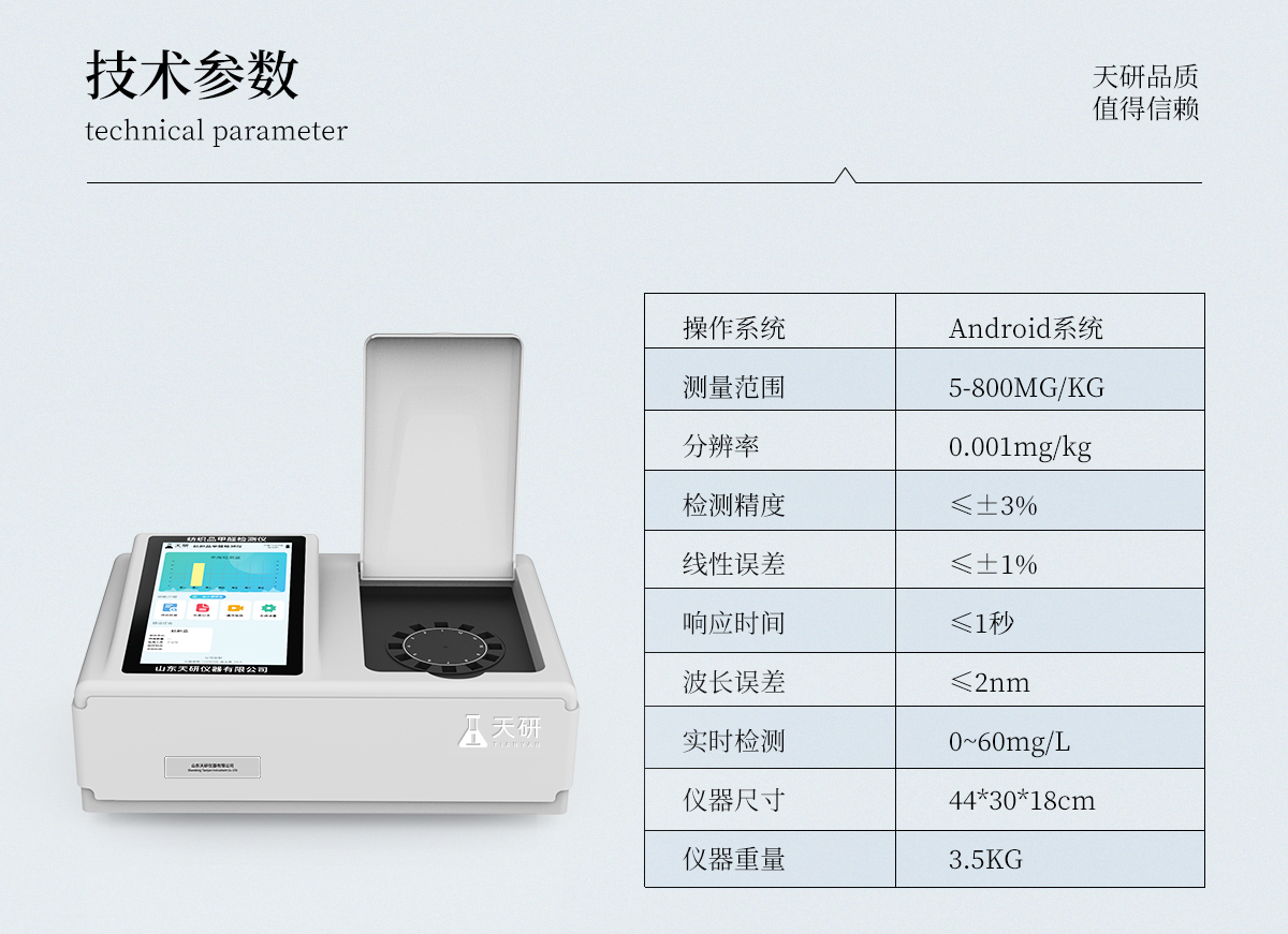 | 1、智能**且方便 | ①智能芯片:主控芯片采用ARM Cortex-A7,RK3288/4核處理器,搭配安卓智能操作系統,集實驗操作,分析結果,打印報告等功能于一體,使用方便,性能更強。 | ②大屏顯示:采用10.1英寸液晶觸摸屏,單機即可操作,無需連接外部顯示或控制器。 | ③多樣同檢:儀器具有12個檢測通道,可同時一次性檢測11個樣品,效率更高。 | ④工作預設:具有任務預設模塊,一鍵提前預設樣品所有信息內容。來樣時可直接檢測,同時可多次調取。 | ⑤數據分析:設備首頁自動匯總分析數據,并繪制柱形分析圖,各項檢測數據一目了然,快捷直觀。 | ⑥高度集成:模塊高度集合,將分光光度模塊、數字化管理模塊、無線通訊模塊集成于一體??蓪z測結果進行分析,直接上傳至數據平臺,實現數據共享,方便后期進行數據分析與統計。 | ⑦遠程升級:儀器具備遠程升級功能,可遠程升級程序,無需返廠,并可持續性免費更新系統版本,降低成本及運輸損耗風險。 | 2、檢測精準且直觀 | ①**技術:精密旋轉比色池,使用同芯片同光源校準精度,解決不同光源之間存在波長誤差的問題,更加準確**。 | ②結果直觀:儀器自動對檢測結果與國標限量值進行對比,自動判定結果是否合格,結果更直觀。 | 3、功能強大且實用 | ①存儲功能:設備可以存儲數據100000組,可在屏幕上直觀查看歷史數據,可導出數據。 | ②打印功能:設備自帶打印功能,可對樣品信息及檢測結果無限次隨意打印。 | ③全新方式:新創自定義打印方式,可按需靈活勾選控制:二維碼,抽樣信息、檢測信息,受檢信息、復核信息、抽樣日期、檢測日期等信息的打印 | ④多重編輯:樣品信息可多重編輯,可以對每個通道屬性和樣品信息單獨進行編輯,例如樣品信息、抽樣信息、檢測信息,受檢信息、復核信息、抽樣日期、檢測日期等信息等。 | ⑤雙語設計:全中文/英文操作菜單,簡單實用,適用于不同用戶的需求。 |