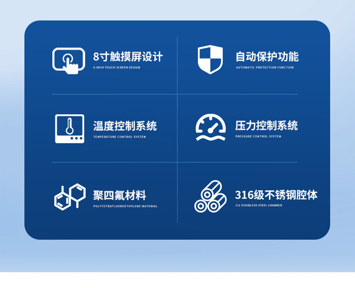 儀器采用微波非脈沖連續自動變頻控制,延長了儀器的使用壽命和電磁波的均勻性,腔體采用52L大容積316L不銹鋼腔體材料制成,自鎖式緩沖防爆爐門,當反應異常時,緩沖結構確保操作人員人身安全和爐門結構完整無損,爐門和腔體結合緊密,微波泄漏符合國家標準。儀器采用溫、壓雙控系統對消解實驗的壓力和溫度進行控制,實時顯示。360°同向連續旋轉,微波均勻,確定各個樣品微波環境相同,提高實驗結果的一致性。當罐內的壓力超過設定的保護值時,微波會自動停止加熱。安全防爆膜具有雙保險功能,當罐內的壓力超過防爆膜所能承受的壓力時,防爆膜先行破裂,氣體瀉出,防止罐體受損和對人體的傷害。