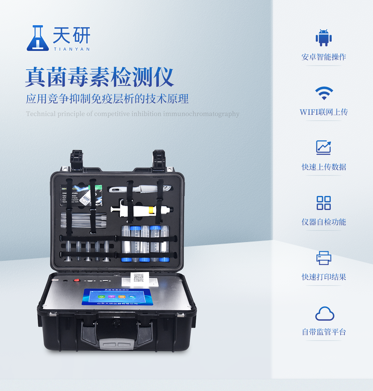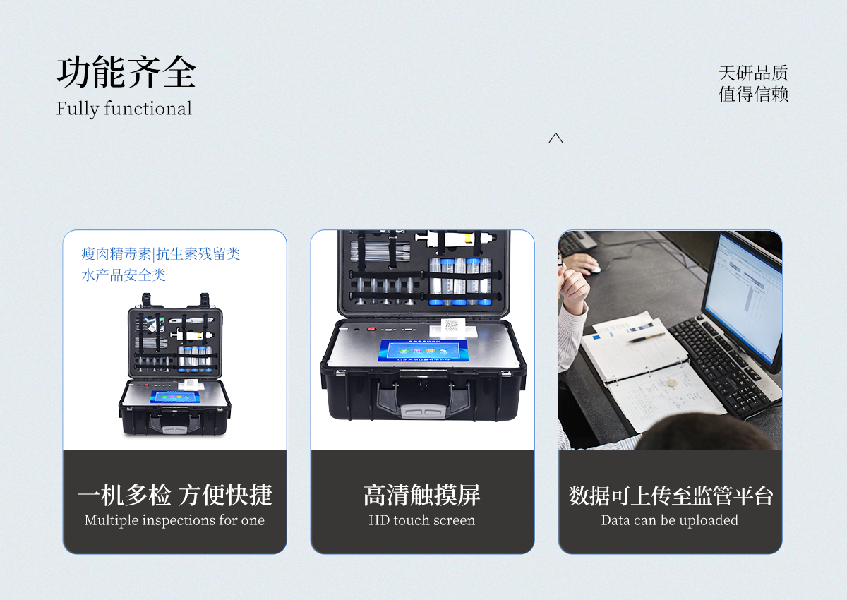 | 用途:可用于糧食谷物及其制品、飼料、植物油中真菌毒素快速定量測定; | 檢測方法:采用發光定量免疫層析技術,激光激發,掃描方式收集發光熒光信號。 | 定量參數設定:RFID芯片記錄檢測目標的標準曲線,根據不同樣本類型配備多參數卡; | 識別功能:試劑插卡后儀器自動識別檢測項目; | 靈敏性和特異性:不受外界的背景干擾, 檢測限為0.4-4500ug/kg;對其它毒素無非特異反應; | 穩定性:無淬滅和光漂白現象; | 檢測時間快,實時顯示檢測曲線 | 無需孵育器,室溫(15-30℃)下進行測試 | 數據獲取和處理:檢測結果自動獲取(無需目測),可實時打印檢測報告;數據可儲存,可導出。 | 儀器可靠:有開機系統自檢功能;儀器配有質控卡,確保檢測系統自身的準確性; | 檢測數據精準可靠:HPLC/LC-MS結果接近 | 檢測儀器獲得國家認證 | 聯網:網絡接口 | 升級:可以通過U盤進行軟件升級 | 存儲空間:≥32G,**擴展至64G | 工作功率:40W | 操作系統:windows 7 | 顯示屏:可觸摸顯示屏,屏幕尺寸≥8寸 | 定量檢測項目:包括黃曲霉毒素B1、嘔吐毒素、玉米赤霉烯酮、T-2毒素、伏馬毒素 |