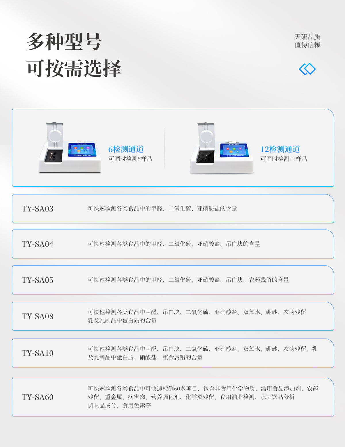 | 儀器采用臺式一體化系統檢測技術,將分光光度模塊、新型農殘檢測模塊、數字化管理模塊、無線通訊模塊高度集成于一體,支持檢測200種食品安全檢測項目,同時預留升級檢測方法。 | 儀器檢測模塊標準化、智能化,可隨意自由組合。檢測箱體內置多個標準檢測單元,檢測模塊可以調整配置。 | 儀器采用全新安卓智能系統,主控芯片采用 ARM Cortex-A7,RK3288/4核處理器,10.1寸高清液晶觸摸豎屏,更加**的UI交互界面,運轉快捷;儀器配備無線通信模塊: 4G(APN)通訊模塊、Wifi模塊,藍牙傳輸,同時具有雙USB接口以及RJ45接口能以多種方式實現數據保存和數據傳輸功能。 | 創新檢測模式: | ★檢測通道:≥12通道;采用精密旋轉比色池設計,使用同芯片同光源校準精度,解決不同光源之間的誤差值。1-12通道間誤差0.1%。(**號:ZL202022821055.2) | ★儀器具有自動識別比色皿檢測功能,即:將樣品比色皿放入儀器后,點擊樣品檢測,儀器自動識別比色皿進行通道檢測。 | 進口高精光源: | 高精度進口四波長冷光源,通道配置 410、520、590、630nm 波長光源,一個光源芯片驅動一個光源,誤差極小,每臺設備單獨**校準光源,**比對,同時參照四種不同波段光源全方位覆蓋市面上99%的農殘食品項目檢測。 | 智能化操作系統: | 便捷操作系統:設備檢測時可在同一檢測界面自動對應相關檢測通道一次性選擇1-12個樣品名稱,無須退出界面,節省操作時間。 | 數據集成系統:設備首頁自動統計檢測數據包含:周檢測數據、月檢測數據,全部檢測總數量,均包含檢測總數,合格數,不合格數,以及相關柱形分析圖,對各項檢測數據清晰掌握,無需電腦查詢,更加快捷直觀。 | 項目預設系統:支持添加單個及多個相同或不相同的任務預設,一鍵快速調取,每一個任務分別可以設置不同的樣品、批次、編號、來源、備注、抽樣信息、檢測信息、受檢信息、復核信息等更多信息。無縫鏈接平臺和APP實時查看下發任務。 | 數據監管系統:同步對接監管平臺,數據可局域網和互聯網數據上傳,檢測結果可選擇直接傳至食品安全監管平臺。集成OSS輸出存儲服務、區分設備定向管理應用,進行區域食品安全監管及大數據分析處理與數據統計,檢測區域食品安全長短期動態,達到食品安全問題預估、預警。 | 自定義打印系統:內置全新打印系統,新創自定義打印方式,可按需靈活設置開啟或關閉:產品合格證(國家農業部標準要求),二維碼,抽樣信息、檢測信息,受檢信息、復核信息、抽樣日期、檢測日期等信息的打印。 | 系統遠程更新功能:可定向分客戶分儀器更新系統,按照不同客戶后期實際需求添加項目,無需機器返廠,即可遠程實時升級全新系統,節省時間成本及避免運輸造成設備損壞。 | 儀器主機采用一體化防水、抗壓、防撞擊、防腐蝕箱體設計,同時配備交直流供電,可連接車載電源,可選配大容量充電鋰電池,滿足現場野外檢測需求。 | 安全證書,放心保障:儀器具有中國計量科學研究院校準證書,**認證。 |