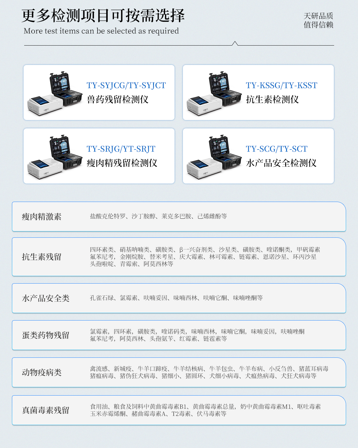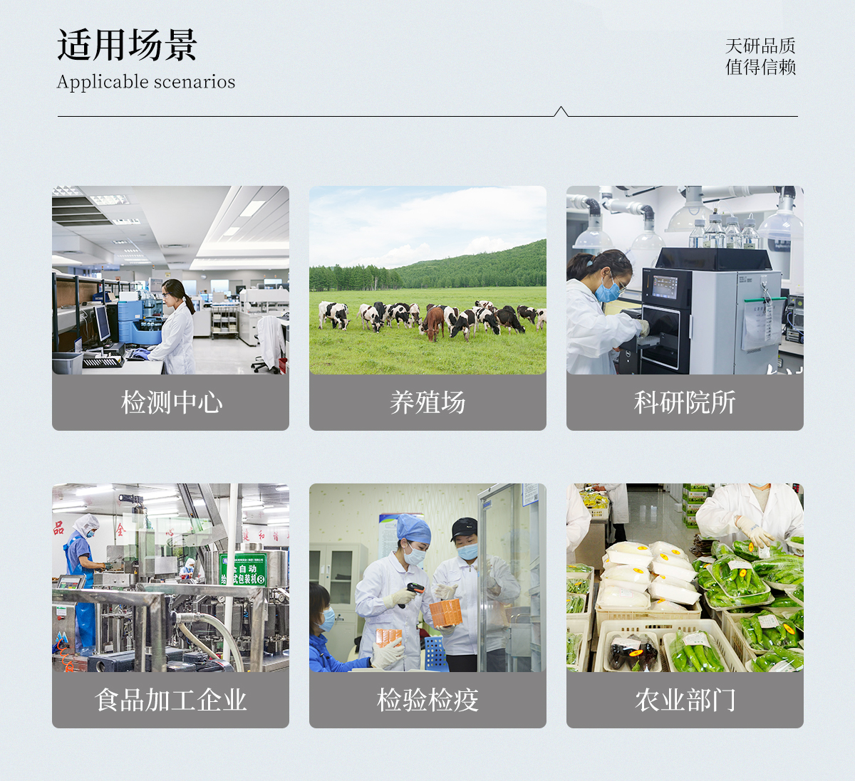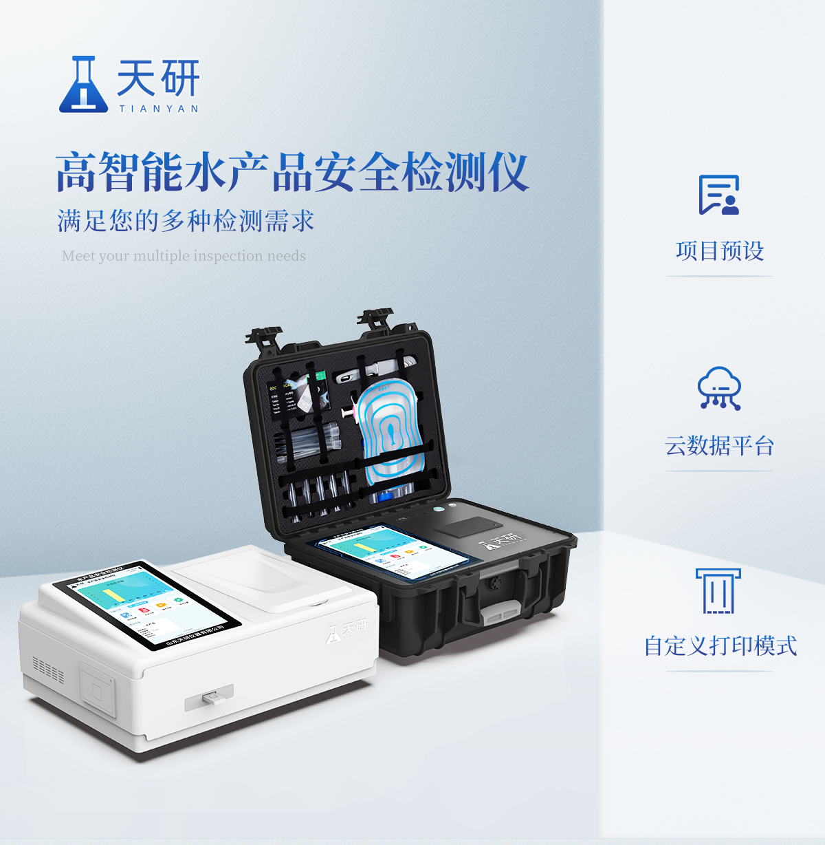 山東天研儀器有限公司生產的水產品安全檢測儀可適用于魚、蝦等水產中孔雀石綠、氯霉素、硝基呋喃類:呋喃唑酮(AOZ)、呋喃它酮( AMOZ )、呋喃妥因(AHD)、呋喃西林(SEM)、呋喃那斯、磺胺類、激素類、四環素類、金霉素、土霉素、甲砜霉素、氟苯尼考、喹諾酮類藥物:噁喹酸、諾氟沙星、恩諾沙星、環丙沙星、氧氟沙星等藥物殘留的定性檢測 該儀器廣泛應用于食藥監局、衛生監督部門、農業部門、商業系統養殖場、屠宰場、食品肉產品深加工企業、畜牧獸醫、檢驗檢疫部門、食品生產企業、農副產品批發市場、農業生產基地、超市、餐廳、高教院校、食堂等單位部門對食品中的不安全指標進行監測使用。