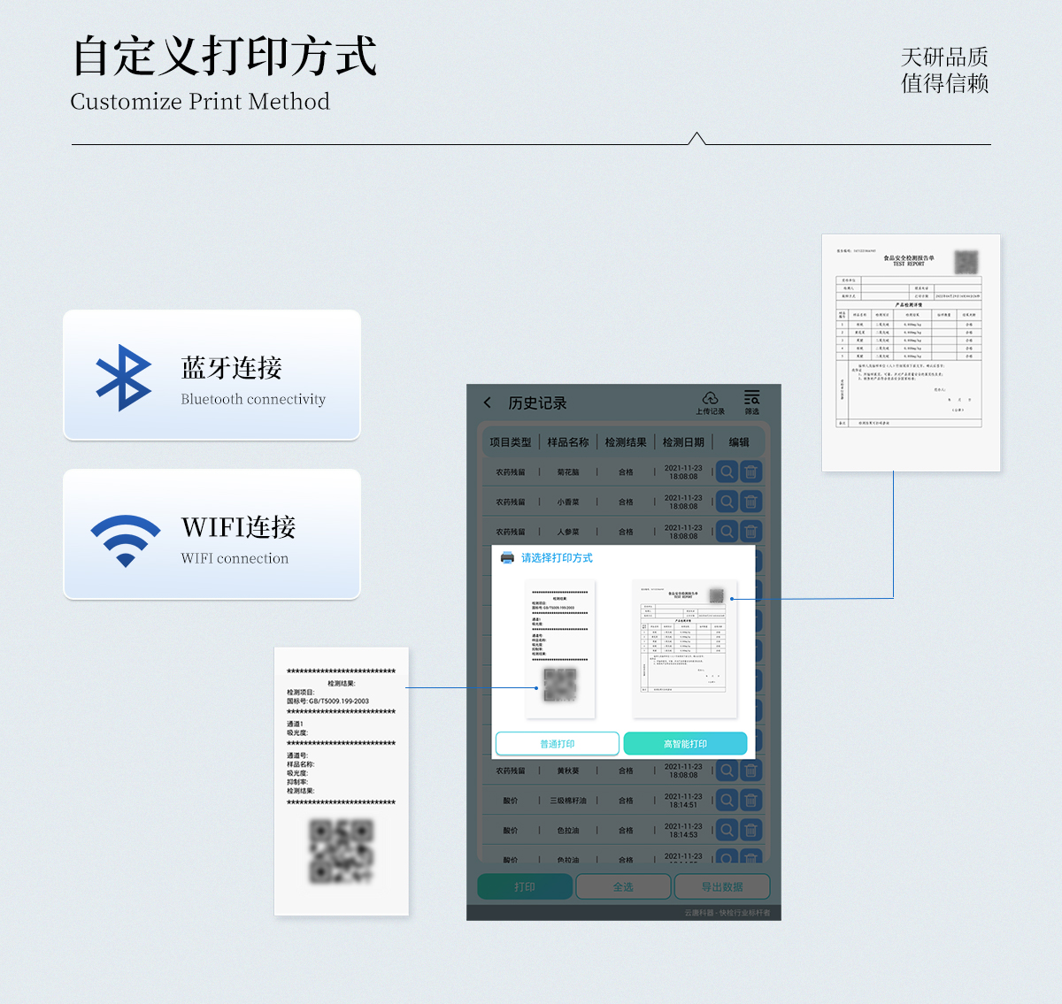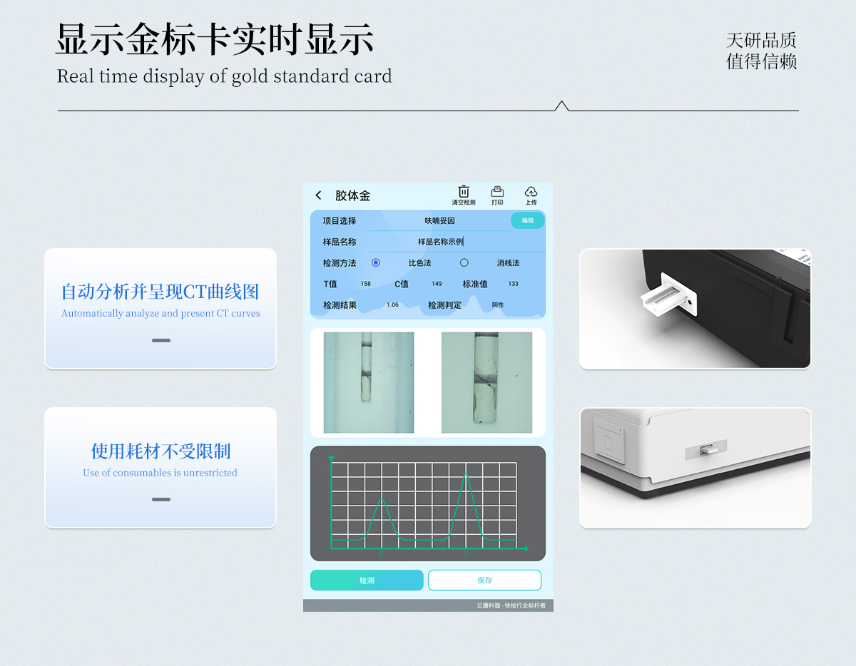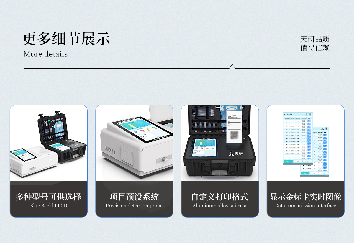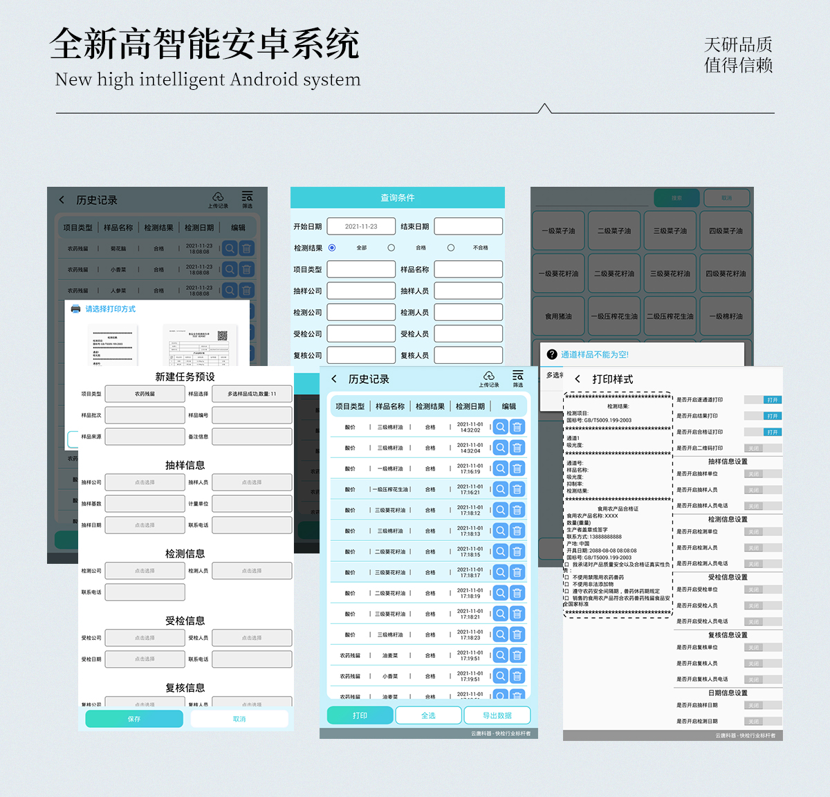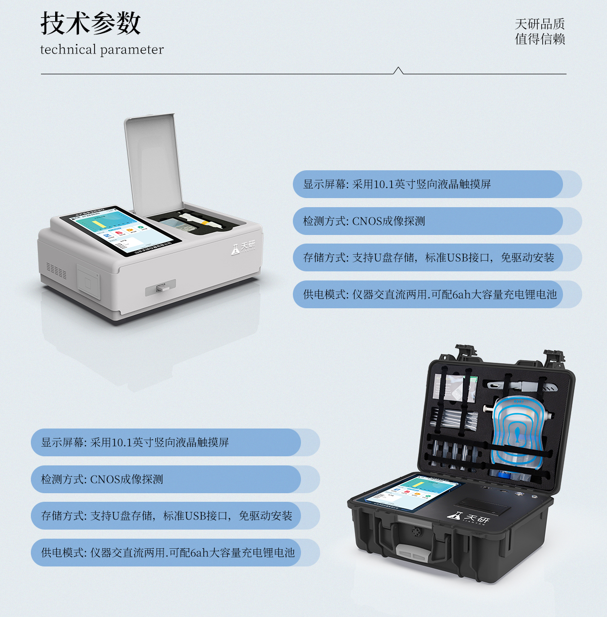 | 儀器采用10.1英寸液晶觸摸屏顯,搭配運行安卓智能操作系統,主控芯片采用ARM Cortex-A7,RK3288/4核處理器,主頻1.88Ghz,運轉速度更快速,性能更強。 | 儀器功能包括:膠體金檢測模塊、數字化管理模塊、無線通訊模塊等,可以滿足同一軟件下實現所有檢測項目的檢測,并在同一窗口展示檢測結果。 | 一體化便攜式快檢設備,采用交直流兩用供電方式,可連接車載電源,配備6ah大容量充電鋰電池,可以滿足現場及流動檢測使用的需求。儀器尺寸:43×35×20cm, 主機凈重:5.1kg | 系統自帶數據集成模塊,設備首頁自動統計檢測數據包含:周檢測數據、月檢測數據,全部檢測總數量,均包含檢測總數,合格數,不合格數,以及相關柱形分析圖,對各項檢測數據清晰掌握,無需電腦查詢,更加快捷直觀。 | 儀器具有任務預設模塊,可在樣品送檢前提前預設樣品名稱、檢測指標、送檢單位等信息,樣品送檢時一鍵調取保存信息,檢測更加方便快捷。 | 膠體金檢測模塊:軌道式自動傳輸掃描方式,可實時顯示金標卡實時圖像,系統自動分析并呈現出CT曲線圖,CT線自動識別,無需手動調整,完成檢測后自動退出檢測卡。 結果判定線可修改,對照值標定值可保存,斷電不丟失數據。 兼容市場上其他膠體金卡,使用耗材不受限制,極大增強用戶使用體驗。 | 儀器檢測系統擁有龐大數據庫,并且構建了完善的檢索、修訂功能。食品庫涵蓋多種樣品名稱,可按需添加或刪除、編輯樣品名稱;產品數據庫以及歷史檢測記錄支持一鍵檢索功能。 | 系統打印自定義化,打印格式多樣化,產品合格證(國家標準要求),二維碼,抽樣信息、檢測信息,受檢信息、復核信息、抽樣日期、檢測日期等信息結果,可按需求自行設置打印內容。 | A4紙版本報告打印功能(可選配):設備擁有兩種結果展示方式,可以自動生成A4打印模板和小票打印模板兩種樣式,可通過WiFi及網線等方式鏈接外置打印機可進行打印 | 儀器具有 wifi 聯網上傳、RJ45網線連接功能,可以快速上傳數據。同步對接監管平臺,數據可局域網和互聯網數據上傳,檢測結果直接傳至食品安全監管平臺。進行區域食品安全監管及大數據分析處理與數據統計,檢測區域食品安全長短期動態,達到食品安全問題預估、預警。 | 設備支持U盤存儲,標準USB接口,免驅動安裝。檢測結果存儲容量20萬條以上,可生成Excel表格,進行一鍵拷貝,并具有登錄保護功能,可設置用戶名及密碼,規范不同人員操作權限,防止非工作人員操作,并且可以進行重新校準、鎖定、恢復出廠設置功能。儀器固件可升級,后期檢測項目可擴充。 | 儀器具備遠程升級功能,可定向分客戶分儀器更新,開機后自動更新,并可持續性免費更新系統版本,無需像傳統產品返廠更新,節省時間及人力成本并避免了物流運輸返廠升級導致設備損壞的潛在風險。 |