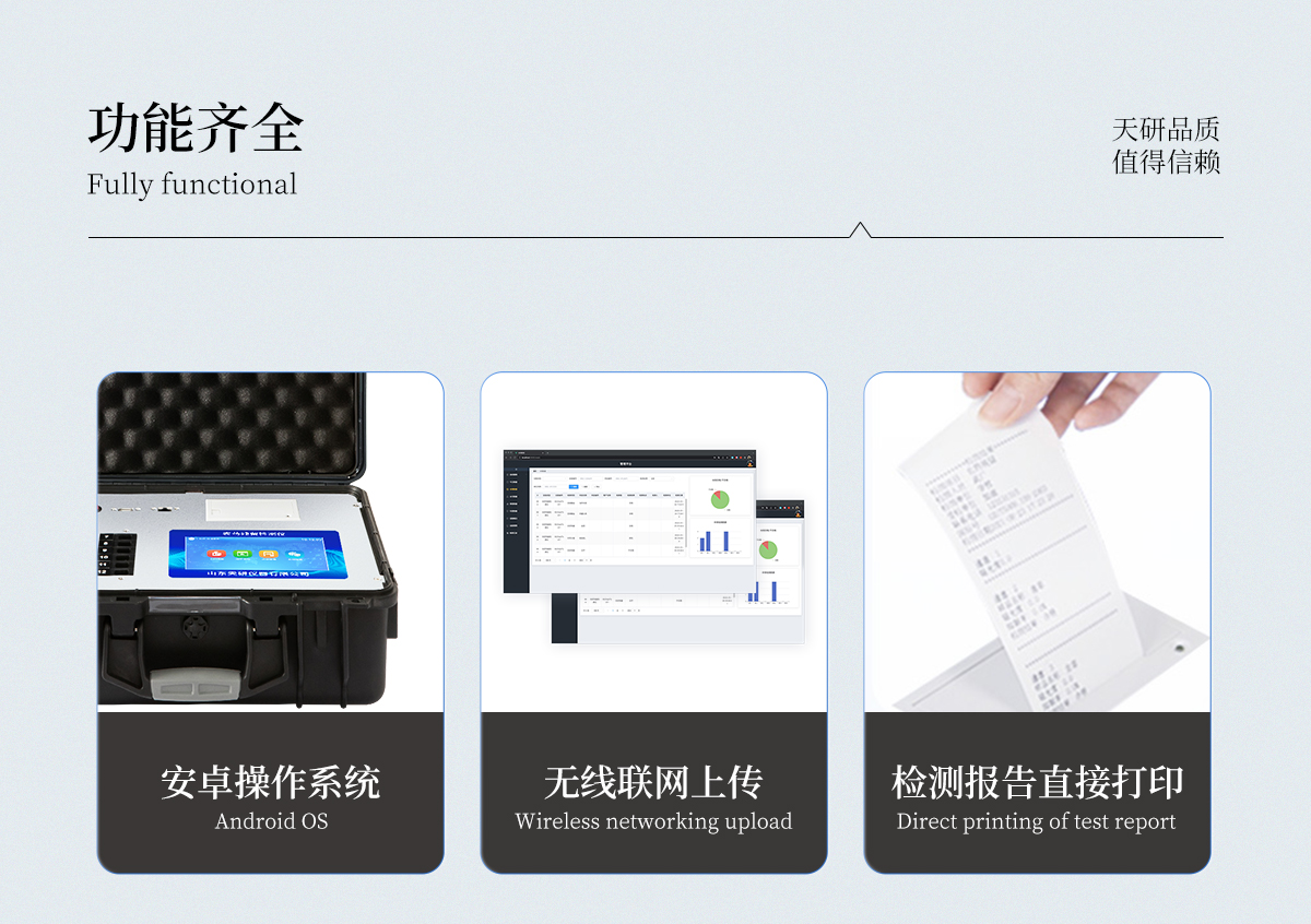 | 機箱采用工業級ABS工程塑料箱,方便攜帶,穩固耐用,便于流動測試。 | 智能操作系統,采用更加人性化操作,主控采用多核處理器,主頻1.88Ghz,運轉速度更快速,穩定性更強。 | 自動判斷樣品是否合格,檢測結果更加直觀。 | 儀器具有100多種蔬菜名稱菜單庫,分類管理,并可按需添加或刪除蔬菜名,編輯蔬菜名稱,可直接打印出蔬菜名稱。 | 檢測通道:6個檢測通道,可以同時測試多個樣品,循環檢測,即放即檢,每個樣品由程序控制分別獨立工作,不會互相干擾。 | 儀器具有wifi聯網功能,可將數據快速上傳電腦,進行數據管理與統計,4G信號GPRS遠傳功能,可插手機卡實現數據遠傳平臺,。 | 顯示方式:7英寸高靈敏真彩觸摸屏顯示,人性化中文操作界面,讀數直觀、簡單。 | 打印機采用串口5v打印,可選擇手動打印或者自動打印,三分鐘出打印結果,打印格式為檢測人姓名、吸光度差值、檢測時間、檢測機構、樣品名稱及結果判定。 | 光源采用進口超高亮發光二極管,具有低功耗、高精度、穩定性強、光源可控可以關掉不使用的光源,響應速度快等優點。 | 智能恒流穩壓,光強自動校準,長時間連續工作光源無溫漂現象。 | 采用USB2.0接口設計,方便數據的存貯和移動,并可隨時與計算機直接相連,并且可用計算機控制儀器。實現數據查詢、瀏覽、分析、統計、打印等。 | 智能化程度高,儀器具有自檢功能:具有開機自檢和調零功能,具有自動檢測重復性功能 | 儀器具有自身保護功能,可設置用戶名及密碼,防止非工作人員操作等。 | 采用DC12v直流供電,安全系統更高,并且配備6A鋰電池充電器。 | 儀器具有重新校準、鎖定、恢復出廠設置功能。 |