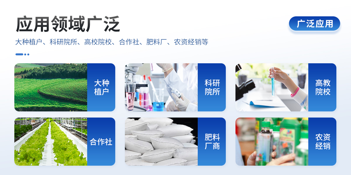 | 1、土壤養分: ●土壤總有機碳TOC、土壤碳氮比、銨態氮、土壤有效磷、土壤速效鉀、土壤硝態氮、土壤水解氮、土壤全氮、土壤全磷、土壤全鉀、土壤有機質(丘林法)、土壤有機質(浸提法)、PH值、含鹽量、水分。 ●土壤中微量元素:土壤鈣、土壤鎂、土壤硫、土壤硅、土壤硼、土壤鐵、土壤銅、土壤錳、土壤鋅、土壤氯; ●土壤重金屬:土壤鉛、土壤砷、土壤鎘、土壤鉻、土壤汞。 | 2、肥料養分: ●有機肥總有機碳TOC、有機肥碳氮比、全氮、有機肥全磷、有機肥全鉀、有機肥硝態氮、有機肥速效磷、有機肥速效鉀、有機肥酸解氮、有機質; ●復合肥碳氮比、全氮、復合肥全磷、復合肥全鉀; ●水溶肥碳氮比、全氮、水溶肥全磷、水溶肥全鉀; ●葉面肥碳氮比、全氮、葉面肥全磷、葉面肥全鉀; ●水溶性腐植酸(風化煤)、水溶性腐植酸(褐煤)、水溶性腐植酸(泥炭)、游離態腐植酸(風化煤)、游離態腐植酸(褐煤)、游離態腐植酸(泥炭); ●單質肥:氮肥中銨態氮、肥料硝態氮、尿素氮、縮二脲、磷肥中磷、磷肥中水溶性磷、鉀肥中鉀; ●各種肥料微量元素:肥料鈣、肥料鎂、肥料硫、肥料硅、肥料硼、肥料鐵、肥料銅、肥料錳、肥料鋅、肥料氯; ●肥料重金屬:肥料鉛、肥料砷、肥料鎘、肥料鉻、肥料汞。 |
