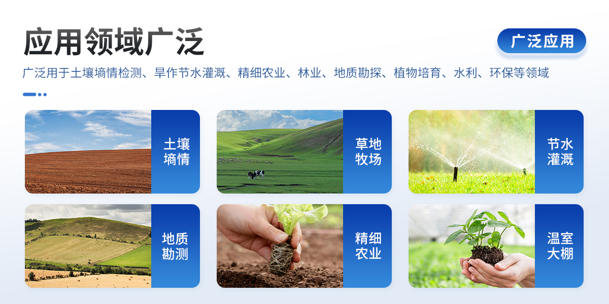 土壤水分溫度鹽分PH測定儀采用一體化結構設計,可快速準確測量土壤中含水量、溫度、電導率(鹽分)、酸堿度,可對多處樣地、不同土壤深度的水分含量溫度鹽分和PH進行快速檢測和長期連續監測。廣泛應用于土壤墑情檢測、旱作節水灌溉、精細農業、林業、地質勘探、植物培育、水利、環保等領域。