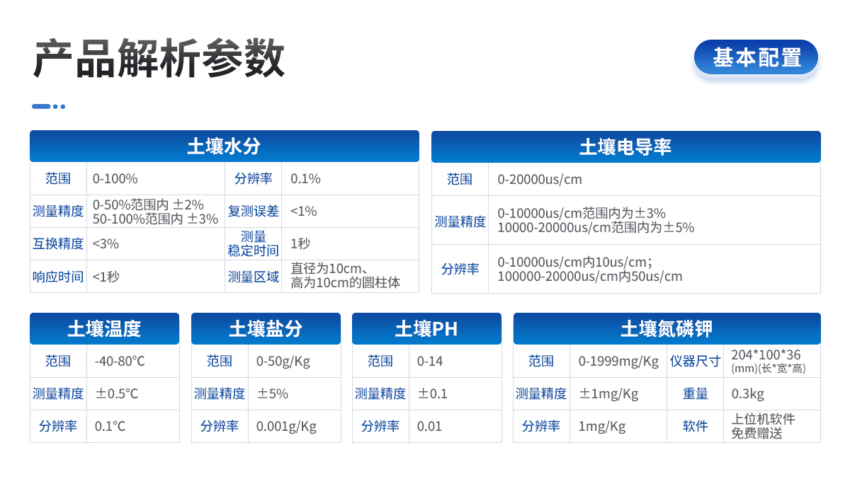 | 測量參數:土壤容積含水量; 單位:%(m3/m3); 測試靈敏度:±0.01 %(m3/m3); | 量程:0-100%(m3/m3) 測量精度:0-50%(m3/m3)范圍內)±2%(m3/m3); | 50-100%(m3/m3)范圍內)±3%(m3/m3); 分辨率:0.1% | 土壤溫度范圍:-40-120℃ 測量精度:±0.2℃ 分辨率:±0.1℃ | 土壤鹽分范圍:0-20ms 測量精度:±2% 分辨率:±0.1ms | PH測量范圍:0-14 分辨率:0.1 測量精度:±0.2% | 集成電極:土壤水分,土壤溫度,土壤鹽分三合一,集成到一個傳感器; | ph復合電極:電極為復合電極,自動溫度補償,測試更穩定更準確。 | 儀器尺寸:10×21×3.5cm | 供電方式:鋰電池供電、交流電兩種方式 | 軟件:上位機軟件免費贈送 |