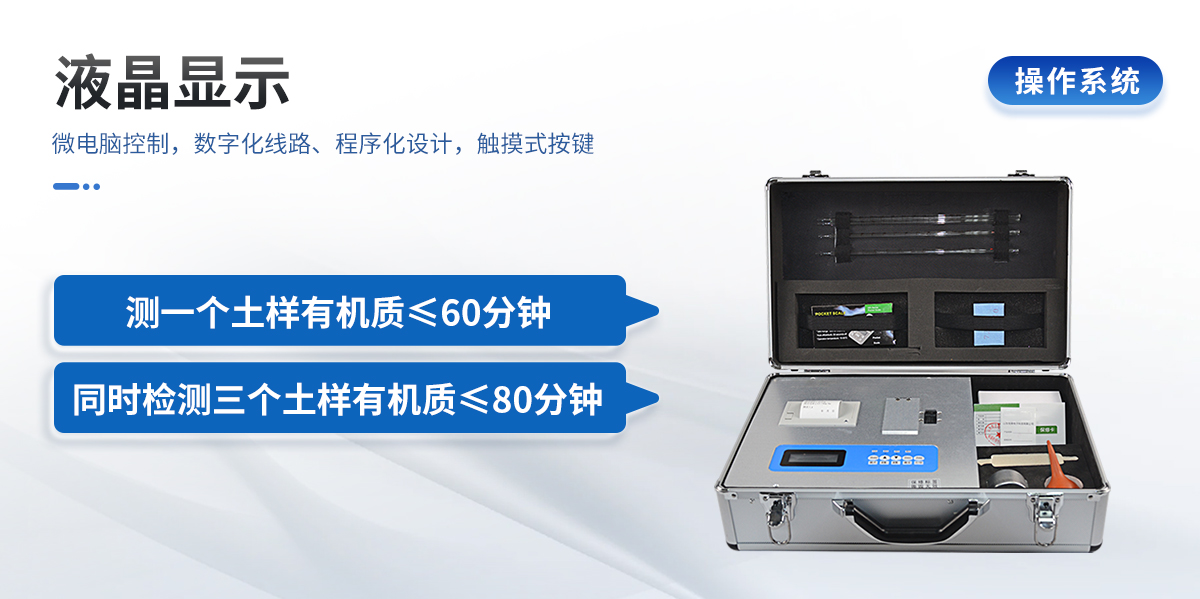 | 配套齊全:土壤有機(jī)質(zhì)速測(cè)儀該儀器集藥、器、儀為一體,攜帶方便,相當(dāng)于一個(gè)小型實(shí)驗(yàn)室。適于農(nóng)業(yè)服務(wù)部門或農(nóng)資經(jīng)銷商、肥料廠商測(cè)土施肥和鑒別肥料真假。 | 操作簡(jiǎn)便、速度快捷,成品藥劑開(kāi)瓶即用,無(wú)須配置。 | 性能可靠:工作穩(wěn)定性優(yōu)于國(guó)家標(biāo)準(zhǔn)JJG179-90指標(biāo)的6倍,重復(fù)性達(dá)到光柵型分光光度計(jì)指標(biāo)水平。 |