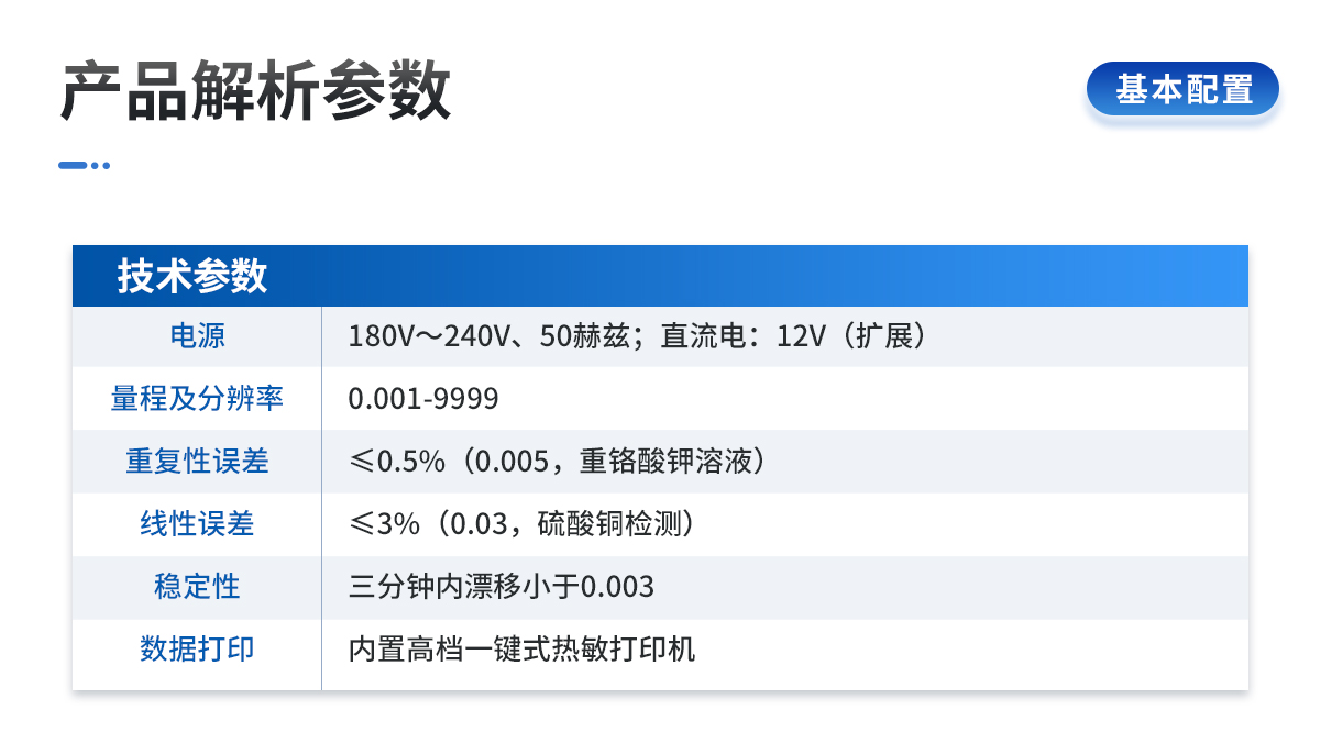 | 電源:交流電:180V~240V、50赫茲;直流電:12V(擴(kuò)展) | 量程及分辨率:0.001-9999 | 穩(wěn)定性:三分鐘內(nèi)漂移小于0.003 | 線性誤差:≤3%(0.03,硫酸銅檢測(cè)) | 重復(fù)性誤差:≤0.5%(0.005,重鉻酸鉀溶液) | 靈敏度:紅光≥4.5 ×10-5 藍(lán)光≥3.17×10-3 | 波長(zhǎng)范圍:紅光620±8nm 藍(lán)光440±8nm | 測(cè)試速度:測(cè)一個(gè)土樣有機(jī)質(zhì)≤60分鐘(含前處理時(shí)間) | 可同時(shí)檢測(cè)8個(gè)土樣≤個(gè)小時(shí)(含前處理時(shí)間) | 數(shù)據(jù)打印:內(nèi)置高檔一鍵式熱敏打印機(jī)(國(guó)內(nèi)首家**設(shè)計(jì)) |