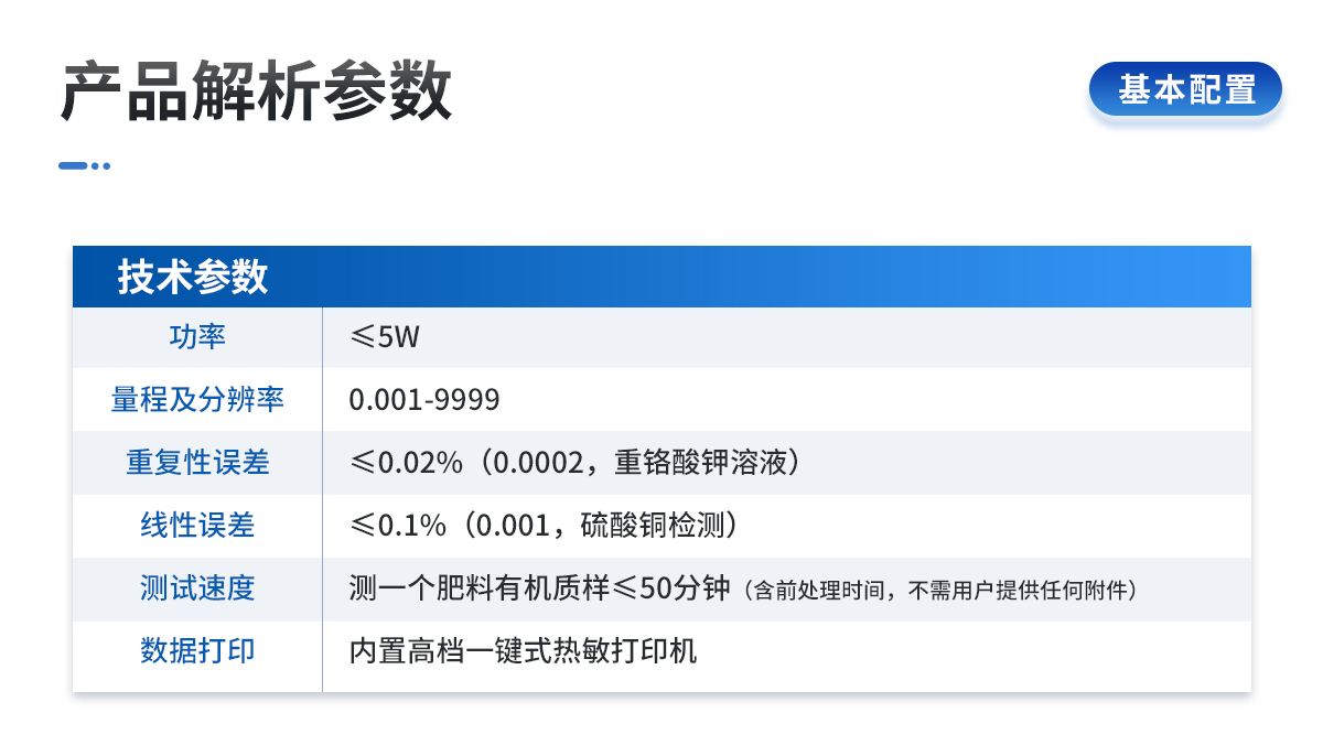 | 可檢測化肥、有機肥(含葉面肥、水溶肥、噴施肥等)、植株中的有機質、腐殖酸等。 | 安卓智能操作系統,采用更加**和人性化操作,儀器標配wifi聯網上傳、4G聯網傳輸、GPRS無線遠傳,快速上傳數據。 | 采用精密旋轉比色池設計,光源一致性更加**保證檢測精度。一次性可快速檢測12個樣品,極大提升檢測效率,降低檢測成本。 | 儀器配有數據接收平臺,無需數據線,數據可直接局域網和互聯網無線上傳,方便進行數據管理和數據長期分析。 | 儀器內置新一代高速熱敏打印機,檢測完成可自動打印檢測報告和二維碼。 | 高靈敏7寸電容觸摸屏,高清晰高交互顯示,大程度降低傳統儀器的繁瑣操作和失誤。 | 每個通道均配置四波長冷光源,所有光源實現恒流穩壓,保證波長穩定。 硅半導體作為信號接收系統,壽命長達10萬小時級別。重現性好,準確度高。 |