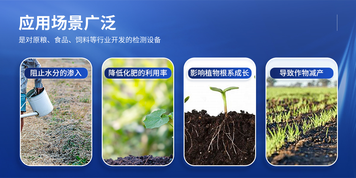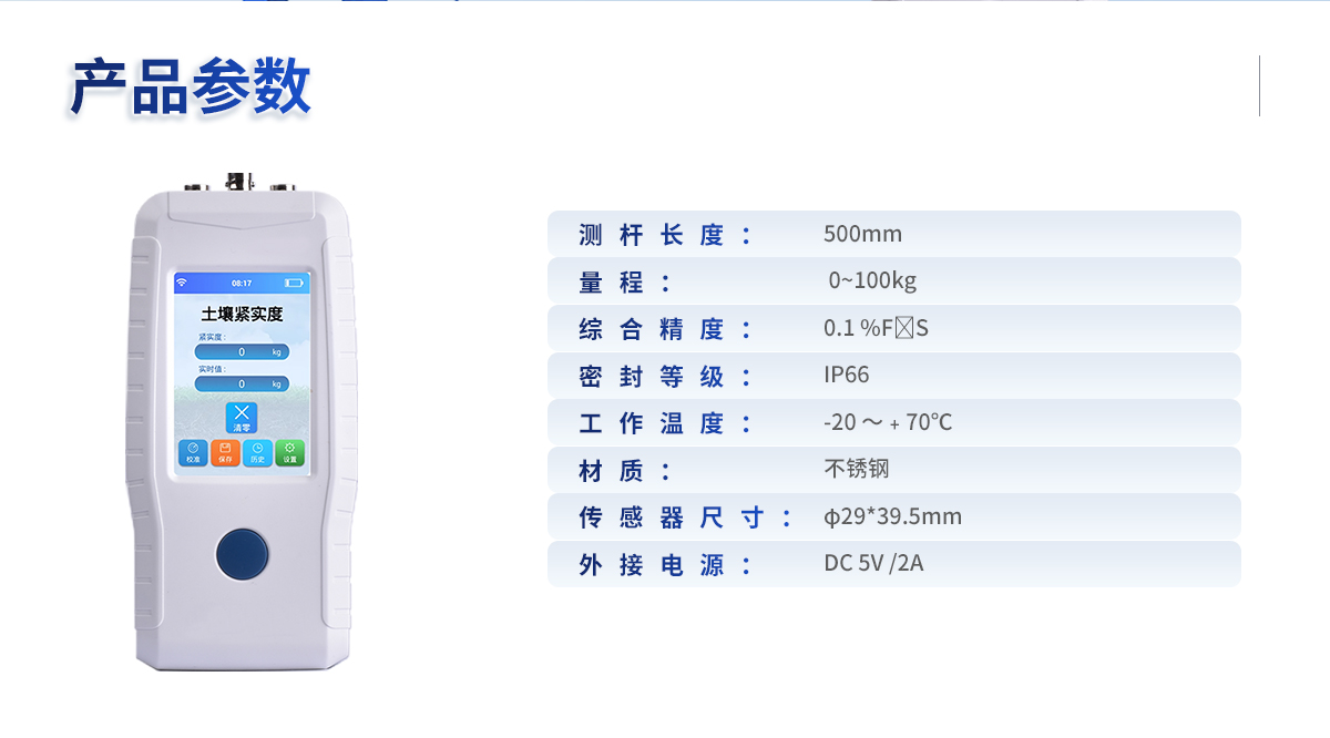 土壤緊實度由土壤抗剪力、壓縮力和摩擦力等構成。是土壤強度的一個合成指標。金屬柱塞或探針壓入土壤時分動載和靜載兩種方法,不同方法的測定值不同,但有聯系。柱塞的形狀有錐體、平頭、圓球及楔子等,這些對測定值也有影響。對同一種方法的測定值,主要決定于土壤質地、容重和含水量。其中含水量的影響**。土壤緊實度可預測土壤承載量、耕性和根系伸展的阻力。土壤緊實度的大小可影響作物根系的穿孔和生長,是一個重要的土壤物理特性指標,用于評價土壤耕性。緊實的土壤可阻止水分的入滲,降低化肥的利用率,影響植物根系生長,導致作物減產。