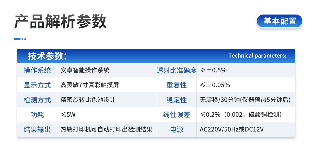 | 1.電源:交流 220±22V 直流 12V+5V(儀器內置鋰電池也可用車載電源) | 2.功率: ≤5W | 3.量程及分辨率:0.001-9999 | 4.重復性誤差: ≤0.02%(0.0002,重鉻酸鉀溶液) | 5.儀器穩定性:一個小時內顯示數字無漂移(透光度測量);兩個小時內數字漂移不超過0.3%(0.003,透光度測量)、0.001(吸光度測量)。 | 6.線性誤差: ≤0.1%(0.001,硫酸銅檢測) | 7.靈敏度:紅光≥4.5 ×10-5 藍光≥3.17×10-3 綠光≥2.35×10-3 橙光≥2.13×10-3 | 8.波長范圍 :紅光:680±2nm; 藍光:420±2nm; 綠光:510±2nm;橙光:590±4nm | 9.顯示屏分辨率:1024*600 | 10.抗震等級:IP65 | 11、儀器尺寸:48×34.5×22cm | 12、主機凈重:5.2kg |
