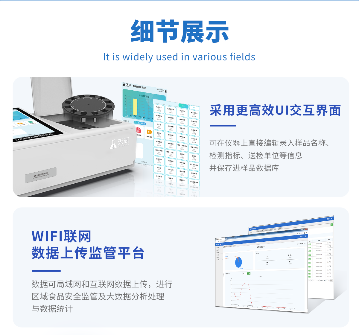 | 儀器采用手提式一體化系統(tǒng)檢測技術(shù),將分光光度模塊、新型農(nóng)殘檢測模塊、數(shù)字化管理模塊、無線通訊模塊高度集成于一體,支持檢測200種食品安全檢測項(xiàng)目,同時預(yù)留升級檢測方法。 | 儀器檢測模塊標(biāo)準(zhǔn)化、智能化,檢測項(xiàng)目可隨意自由組合。檢測箱體內(nèi)置多個標(biāo)準(zhǔn)檢測單元,檢測模塊可以調(diào)整配置。 | 顯示屏幕:儀器采用10.1英寸豎向液晶觸摸屏顯,搭配運(yùn)行安卓智能操作系統(tǒng),主控芯片采用ARM Cortex-A7,RK3288/4核處理器,主頻1.88Ghz,操作方便,性能更強(qiáng)。 | 檢測通道:≥12通道;采用精密旋轉(zhuǎn)比色池設(shè)計(jì),使用同芯片同光源校準(zhǔn)精度,解決不同光源之間的誤差值,更加準(zhǔn)確**。(1-12通道間誤差0.1%,**號:ZL202022821055.2) | 儀器光源:高精度進(jìn)口四波長冷光源,每個通道均配置 410、520、590、630nm 波長光源,標(biāo)配**的光路切換裝置,**光路切換功能可實(shí)現(xiàn)64波長,并且所有檢測項(xiàng)目可實(shí)現(xiàn)所有通道同時檢測。 | 設(shè)備可一鍵校準(zhǔn),自動保存校準(zhǔn)數(shù)據(jù),自動對比校驗(yàn),得到精準(zhǔn)光源,采用Android SP存儲數(shù)據(jù),光源數(shù)據(jù)永不丟失,方便每一次使用。 | 通訊接口:配備無線通信模塊、4G(APN)通訊模塊、藍(lán)牙傳輸,同時具有雙USB接口以及RJ45網(wǎng)線接口,可以多方式實(shí)現(xiàn)數(shù)據(jù)保存及數(shù)據(jù)傳輸 | 存儲方式:支持U盤存儲,標(biāo)準(zhǔn)USB接口,免驅(qū)動安裝。檢測結(jié)果存儲容量20萬條以上,可生成Excel表格進(jìn)行拷貝,并具有登錄保護(hù)功能。 | 智能化操作系統(tǒng): | 1)操作系統(tǒng):儀器可在同一檢測界面自動對應(yīng)相關(guān)檢測通道,一次性選擇1-12個樣品名稱,無需退出界面,節(jié)省操作時間。并可以對每個通道屬性和樣品信息單獨(dú)進(jìn)行編輯,例如送檢單位、人員,檢測人員等,打印時勾選打印顯示。 | 2)數(shù)據(jù)集成系統(tǒng):設(shè)備首頁自動匯總分析檢測數(shù)據(jù),包含:周檢測數(shù)據(jù)、月檢測數(shù)據(jù),全部檢測總數(shù)量,均包含檢測總數(shù),合格數(shù),不合格數(shù),以及相關(guān)柱形分析圖,各項(xiàng)檢測數(shù)據(jù)一目了然,無需電腦查詢,更加快捷直觀。 | 3)數(shù)據(jù)庫系統(tǒng):十幾項(xiàng)數(shù)據(jù)庫分類管理儀器:包含項(xiàng)目類型、項(xiàng)目數(shù)據(jù)、檢測數(shù)據(jù)、歷史記錄、國標(biāo)信息、曲線信息、采樣信息、檢測信息、受檢信息、復(fù)核信息、圖表信息、光源校準(zhǔn)信息、打印樣式信息、樣品庫信息等等,數(shù)據(jù)庫之間互相協(xié)調(diào)聯(lián)動保證數(shù)據(jù)的真實(shí)完整性。同時產(chǎn)品數(shù)據(jù)庫以及歷史檢測記錄支持一鍵檢索功能。 | 4)限量規(guī)判系統(tǒng):具有限量查詢、添加物質(zhì)合規(guī)判定系統(tǒng)。檢測出結(jié)果后,系統(tǒng)自動調(diào)用系統(tǒng)數(shù)據(jù)庫中相關(guān)國標(biāo)進(jìn)行比對判定,客觀顯示判定結(jié)果是否合格。 | 5)項(xiàng)目預(yù)設(shè)系統(tǒng):儀器具有任務(wù)預(yù)設(shè)模塊,一鍵提前預(yù)設(shè),給出方便快捷的新檢測方案,每一個任務(wù)分別可以設(shè)置不同的樣品、批次、編號、來源、備注、抽樣信息、檢測信息、受檢信息、復(fù)核信息等更多信息。樣品送檢時一鍵調(diào)取保存信息,并可多次調(diào)取,大大提高檢測效率。 | 6)數(shù)據(jù)監(jiān)管系統(tǒng):同步對接監(jiān)管平臺,數(shù)據(jù)可局域網(wǎng)和互聯(lián)網(wǎng)數(shù)據(jù)上傳,檢測結(jié)果可選擇直接傳至食品安全監(jiān)管平臺。進(jìn)行區(qū)域食品安全監(jiān)管及大數(shù)據(jù)分析處理與數(shù)據(jù)統(tǒng)計(jì),檢測區(qū)域食品安全長短期動態(tài),達(dá)到食品安全問題預(yù)估、預(yù)警。 | 7)打印系統(tǒng):內(nèi)置全新打印機(jī),新創(chuàng)自定義打印方式,可按需靈活勾選控制:產(chǎn)品合格證(國家農(nóng)業(yè)部標(biāo)準(zhǔn)要求),二維碼,抽樣信息、檢測信息,受檢信息、復(fù)核信息、抽樣日期、檢測日期等信息的打印。 | 供電模式:儀器交直流兩用,直流12V供電,可連接車載電源,可配6ah大容量充電鋰電池,電量可實(shí)時顯示,方便戶外流動測試。 | 膠體金檢測模塊:采用雙通道CMOS成像處理技術(shù)及膠體金免疫層析技術(shù),可同時讀取雙膠體金卡數(shù)據(jù),自動采集、處理分析,將檢測結(jié)果顯示,并可根據(jù)參考限值自動判斷檢測結(jié)果,可檢測常見的獸藥殘留、生物毒素、抗生素、違禁添加物等。 | 1)探測技術(shù):CMOS成像探測; | 2)檢測通道:1個通道; | 3)檢測方式:消線法和比色法; | 4)顯示模式:陰性或陽性; | 5)曲線形式:軌道式掃描方式,顯示金標(biāo)卡圖像,實(shí)時生成、識別CT曲線圖,無需手動調(diào)整,完成檢測后自動退出檢測卡。兼容市場上其他金標(biāo)卡,使用耗材不受限制。 | 儀器加入遠(yuǎn)程升級功能,可定向分客戶分儀器更新,開機(jī)后自動更新,客戶無需任何操作,即可升級全新項(xiàng)目。做到了無需退換機(jī)器即可實(shí)現(xiàn)實(shí)時遠(yuǎn)程升級檢測儀器。 |