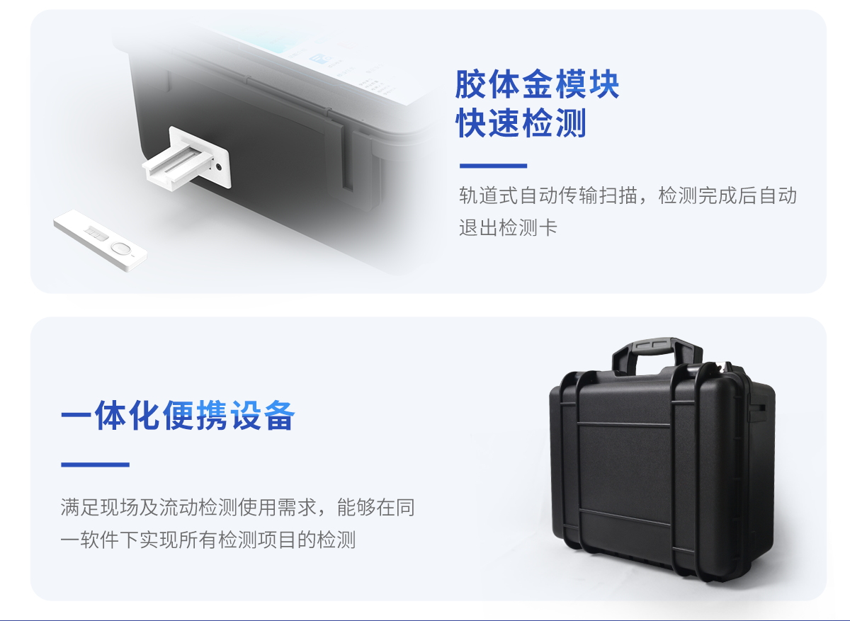 | 安卓智能操作系統,采用更加**UI交互界面,儀器具有wifi聯網上傳、4G聯網傳輸、GPRS無線遠傳、網線連接功能,快速批量上傳數據。 | 智能化程度高,儀器具有自檢功能:具有開機自檢和調零功能,具有自動檢測重復性功能。 | 新一代高速熱敏打印機,檢測完成可自動打印檢測報告和二維碼。 | 儀器帶有監管平臺,數據可局域網和互聯網數據上傳,檢測結果直接傳至食品安全監管平臺。進行區域食品安全監管及大數據分析處理與數據統計,檢測區域食品安全長短期動態,達到食品安全問題預估、預警 | 一體化便攜式快檢設備,滿足現場及流動檢測使用需求,能夠在同一軟件下實現所有檢測項目的檢測,并可通過同一窗口直觀顯示檢測結果。 | 膠體金模塊檢測方式:軌道式自動傳輸掃描,檢測完成后自動退出檢測卡。 | 一體化主機,包含食品安全檢測模塊、多通道農藥殘留檢測模塊、膠體金免疫層析檢測模塊。 | CT線自動識別,無需手動調整。 | 儀器具有品類多種類樣品菜單庫,可靈活選擇檢測樣品,不同的檢測通道可同時檢測不同的樣品項目。。 | 樣品處理簡單省力,整體操作快速、安全、便捷。 | 儀器具有自身保護功能,可設置用戶名及密碼,防止非工作人員操作等。 | 高靈敏度,高檢測精度,高重復性精度,掃描式高精度光學傳感器。 | 儀器具有重新校準、鎖定、恢復出廠設置功能。 | 內置強大的數據庫,可在儀器上直接選擇樣品名稱、檢測指標、送檢單位等信息,也可在儀器上直接編輯錄入樣品名稱、檢測指標、送檢單位等信息并保存進樣品數據庫。 | 儀器具有重新校準、鎖定、恢復出廠設置功能。 | 結果判定線可修改,對照值標定值可保存,斷電不丟失數據。 | 兼容市場上所有的膠體金卡,使用耗材不受限制,極大增強用戶使用體驗。 |